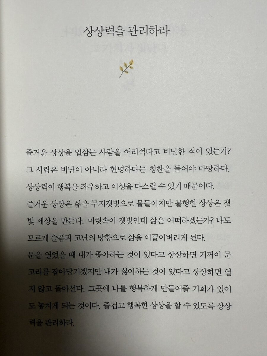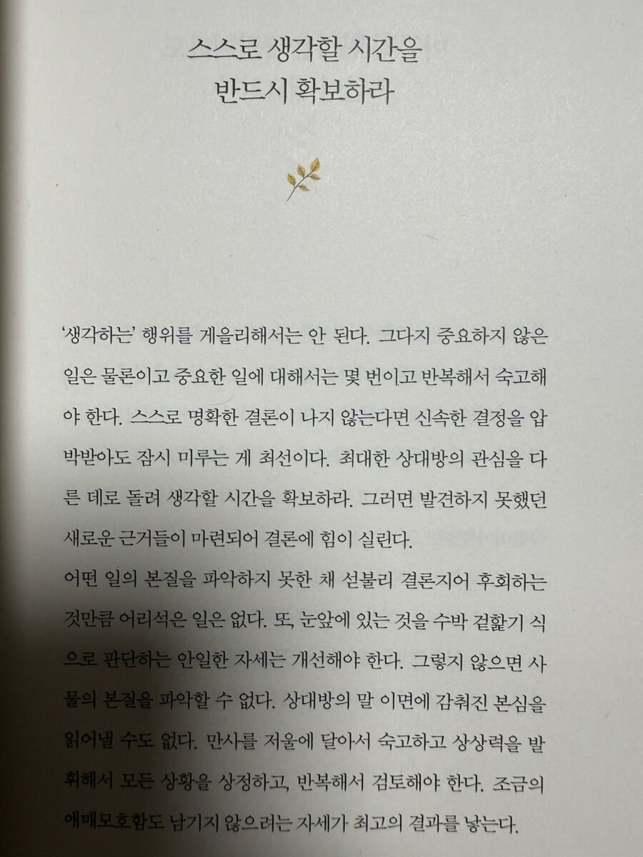 ​책은 아포리즘 형대로 저자의 철학의 정수를 쉽게 설명하고 있다. 총 5장으로 나뉘어 우리 현대인들에게 많은 조언과 위안을 주고 있는 것이다. 4차 산업혁명의 생성형 인공지는 AI의 불확실성이 높아지는 시대를 살아가는 나는 쏟아지는 수많은 정보 속에서 갈길을 잃곤 한다. 현대인인 나는 너무 많은 선택지 앞에서 결정 장애를 겪곤 한다. 완벽한 정보를 기다리다가 기회를 놓치는 일이 반복되었다. 그라시안의 "헷갈리게 하는 사람에게는 빠른 결정을 유도하라"는 조언이 새롭게 다가왔다.