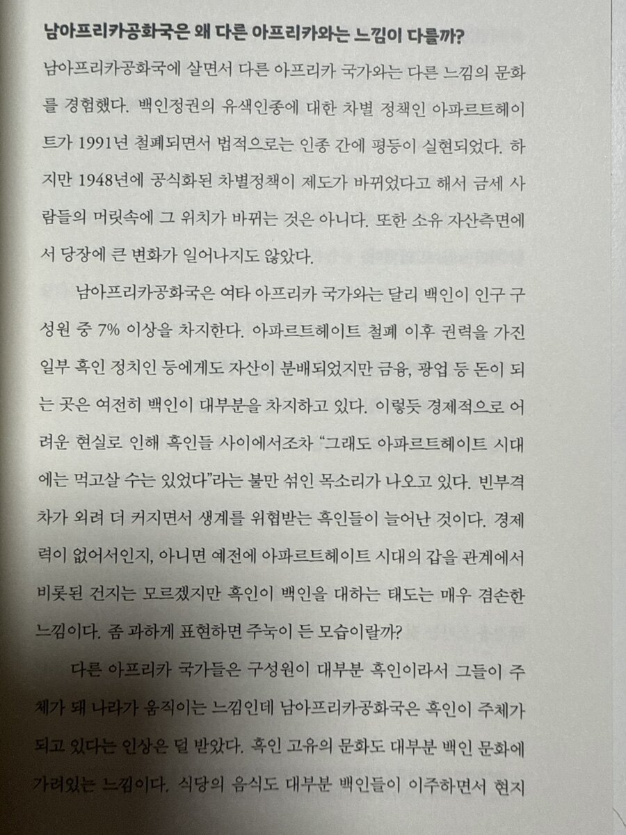 ​아프리카 하면 떠오르는 또 다른 고정관념은 '원시적'이라는 이미지였다. 하지만 남아프리카 공화국의 대규모 쇼핑몰 문화나 와인 산업의 발달상을 보면, 이런 생각이 얼마나 시대착오적인지 알 수 있다. 모로코, 알제리, 튀니지, 케냐, 탄자니아 등 여러 아프리카 국가들이 포도 재배와 와인 제조 기술을 발전시켜 품질 높은 와인을 생산하고 있다는 사실은 내게 완전히 새로운 정보였다. 특히 남아프리카 공화국의 경우, 다른 아프리카 국가들과는 확연히 다른 발전상을 보여주고 있다. 이는 역사적 배경과 지리적 조건, 그리고 다양한 인종이 공존하는 독특한 사회 구조 때문일 것이다. 이 나라가 세계 최대의 백금 생산국이라는 사실도 아프리카의 자원 부국으로서의 면모를 새롭게 인식하게 해주었다.