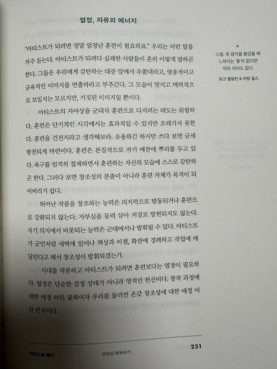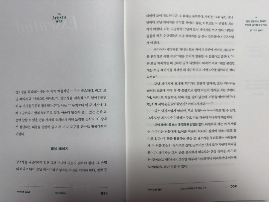 저자는 핵심 실천 방법들도 제안하고 있다. 내적 정화의 도구인 모닝 페이지.모닝 페이지는 이 책의 가장 중요한 도구다. 매일 아침 손으로 써내려가는 세 페이지의 자유로운 글쓰기는 단순해 보이지만 그 효과는 놀랍다. 이 실천은 우리의 의식을 가로막고 있는 온갖 잡념들과 불안들을 종이 위에 쏟아내는 과정이다. 캐머론이 강조하는 것처럼, 모닝 페이지는 "진짜 감정 vs 공식적 감정"을 구분하게 해준다. 우리가 사회적으로 표출하는 감정과 내면에서 실제로 느끼는 감정 사이의 괴리를 드러내는 것이다. "괜찮다고 느낀다"는 표현이 사실은 괜찮지 않다는 신호라는 카메론의 통찰은 특히 예리하다. 이 실천의 진정한 가치는 부정을 뚫고 진실에 도달하게 한다는 점이다. 매일의 모닝 페이지는 우리 자신과 진정한 자아 사이에 있는 흐림을 닦아내는 작업이다. 점차 또렷해지는 자아상은 때로 놀라울 수 있고, 인정하지 못했던 구체적인 취향들과 혐오감들을 발견하게 만든다. 아티스트 데이트는 일주일에 두 시간 정도씩 창조적 의식을 기르기 위해 자신에게만 온전히 집중하는 시간이다. 이 실천의 핵심은 평상시 루틴에서 벗어나 새로운 자극을 받는 것이다. 물리적 활동이든, 정신적 활동이든, 새로운 창조적 시도든 상관없다. 중요한 것은 일상적 사고 패턴에서 벗어나 창조적 의식에 새로운 자양분을 공급하는 것이다.