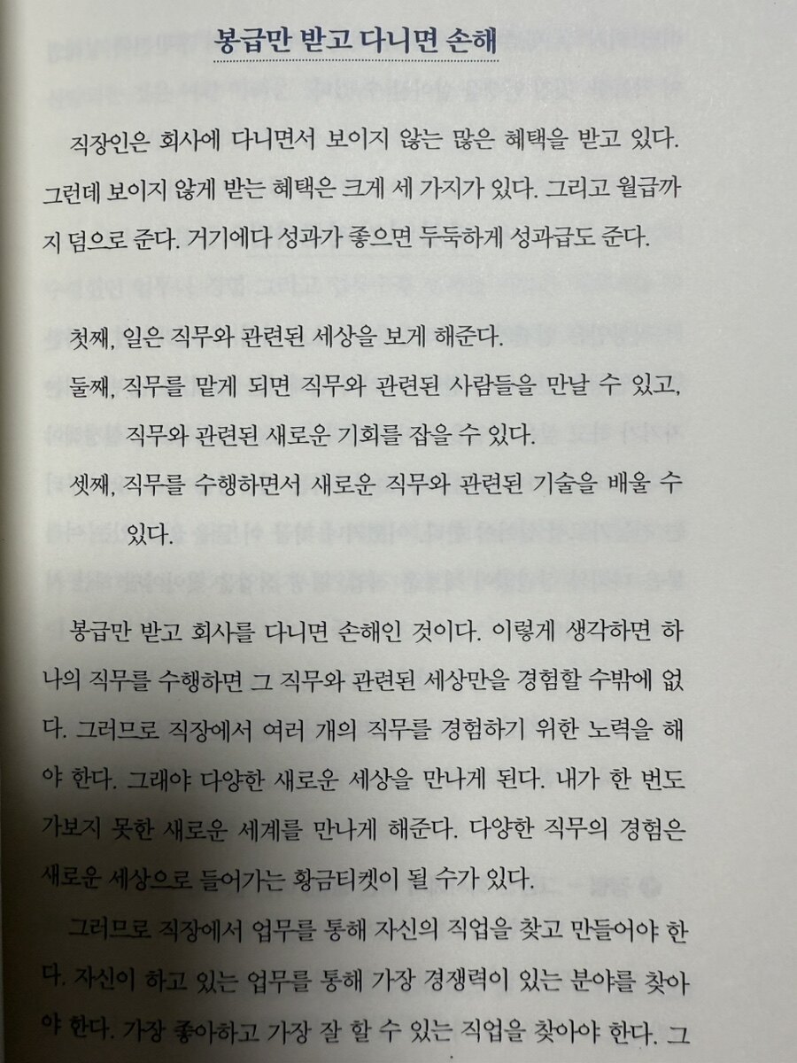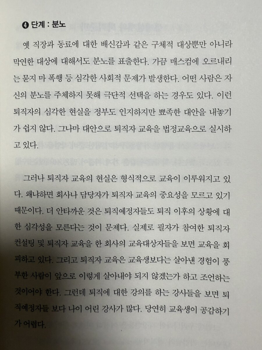 많은 직장인들이 퇴직을 휴식의 시작으로 여기는 것은 시대착오적 사고다. 저자가 책에서 사례로 이야기 하고 있는 한 공장 근무자의 사례에서 보듯이, 40년간 열심히 일했다고 해서 퇴직 후 편안한 여생이 보장되는 것은 아니다. 오히려 가족들로부터 부담스러운 존재가 되어 심리적 고통을 겪는 경우가 많다. 이런 현상이 발생하는 이유는 퇴직자들이 변화된 사회 환경을 제대로 이해하지 못하기 때문이다. 과거의 경험과 성공에만 의존하여 새로운 시대의 요구에 적응하지 못하는 것이다. 이는 나이에 맞지 않는 철 없는 행동으로 귀결되며, 결국 개인과 가족 모두에게 불행을 가져다 준다. 현대 직장인들이 범하는 가장 큰 실수는 첫째, 변화에 적응하지 못하는 것이다. 급변하는 사회와 기술 환경에서 과거의 방식에만 안주하면 경쟁력을 잃게 된다. 둘째, 직업적 역량 개발을 소홀히 하는 것이다. 직장에서의 경험만으로는 퇴직 후 새로운 일자리를 찾기 어렵다. 셋째, 지속적인 학습을 게을리하는 것이다. 새로운 지식과 기술을 습득하지 않으면 시대에 뒤처지게 된다
