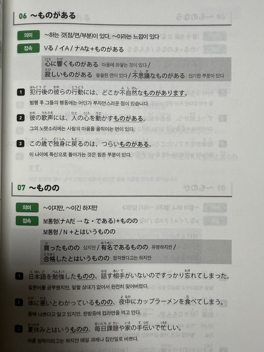 문법 파트는 정말 혁신적이었다. 기존 교재들이 문법을 단순히 나열식으로 설명했다면, 이 책은 의미가 비슷한 문법끼리 테마별로 묶어서 설명했다. 예를 들어 「もの」 시리즈, 「こと」 시리즈처럼 같은 요소를 포함한 문법들을 함께 다루거나, 순접·역접, 가정·조건처럼 기능별로 분류해서 설명했다. 이런 접근 방식 덕분에 문법 간의 차이점과 공통점을 명확히 이해할 수 있었다. 특히 「~に限り」, 「~に限って」, 「~限りでは」처럼 비슷해 보이지만 미묘한 차이가 있는 문법들을 비교해서 설명해준 부분이 인상깊었다. 단순 암기가 아니라 이해를 바탕으로 한 학습이 가능했다. 각 테마마다 연습문제가 수록되어 있어서 배운 내용을 바로 확인할 수 있는 점도 좋았다. 문법을 배우고 나서 바로 적용해볼 수 있어서 학습 효과가 배가되었다.