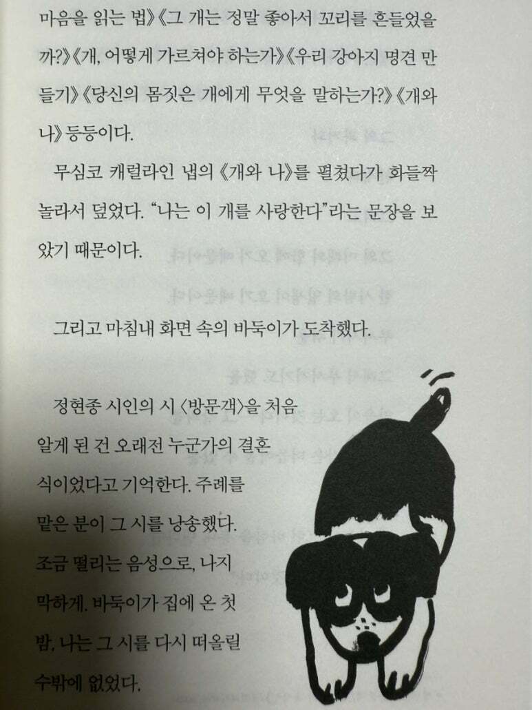 책장을 넘기며 나도 모르게 눈가가 촉촉해졌다. 작가의 바둑이 이야기를 읽으며 우리 집 털복숭이 토토와 보낸 지난날들이 파노라마처럼 스쳐 지나갔다. 그래, 정말 그랬다. 반려견과의 만남은 동물 한 마리가 집에 오는 것이 아니라, 누군가의 과거와 현재, 그리고 미래가 통째로 우리 삶 속으로 들어오는 일이었다. 처음 토토 품에 안았을 때의 그 떨림을 지금도 생생히 기억한다. 작은 심장이 쿵쿵거리며 내 가슴에 닿던 순간, 이 작은 생명이 앞으로 나와 함께 만들어갈 수많은 이야기들을 예감했다. 그때는 몰랐다. 이 작은 존재가 내 일상을 얼마나 완전히 바꿔놓을지를.
