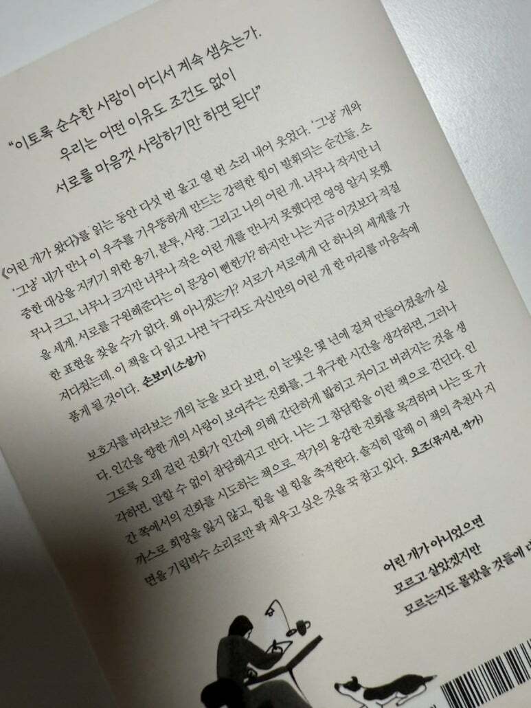 작가가 던진 질문, "당신의 어린 개는 무엇인가요?"를 곰곰 생각해보았다. 물론 우리 집 털복숭이가 내게는 가장 직접적인 '어린 개'였다. 하지만 더 넓은 의미에서 보면, 예상치 못한 순간에 찾아와 삶을 완전히 바꿔놓은 모든 경험들이 '어린 개'가 될 수 있을 것 같다. 토토를 만나면서 나는 더 따뜻한 사람이 되었다. 더 인내심 있고, 더 책임감 있고, 더 감사할 줄 아는 사람이 되었다. 무엇보다 무조건적인 사랑이 무엇인지 배웠다. 이 모든 변화의 시작점에 작은 털복숭이가 있었다는 것이 참 신기하고 고맙다. 지금도 토토는 내 발치에서 스르르 잠들어 있다. 고요한 숨소리를 들으며, 이 일상이 얼마나 특별한 것인지 생각한다