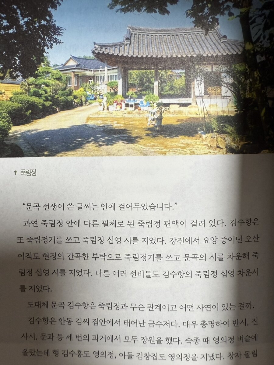 공간에 새겨진 역사의 흔적도 의미를 선사한다. 공간은 시간을 품고 있다. 서울 북촌은 조선시대 양반들의 거주지였고, 서촌은 중인들의 문화 공간이었다. 둘 다 서울 한복판에 위치하지만, 그 역사적 맥락과 의미는 사뭇 다르다. 북촌의 가지런한 한옥 사이를 거닐며 옛 양반들의 일상을, 서촌의 좁은 골목길에서는 중인들의 문화적 저항과 창조성을 느낄 수 있다. 또한 담양 소쇄원에서는 조선 중기 선비들이 스승 조광조의 비극적 죽음 이후 세상을 등지고 자연과 학문에 침잠했던 그 고요한 시간을 만난다. 자연과 인공의 조화로운 배치, 물소리와 바람소리가 어우러지는 공간에서 선비의 품격과 절제된 아름다움을 느낄 수 있다. 이러한 공간들은 우리 역사의 살아있는 증인들이다. 역사의 아픔과 자존심역사는 영광스러운 순간만이 아닌, 아픔과 굴욕의 순간도 함께 담고 있다. 석촌호수 근처에 위치한 삼전도비는 그런 우리 역사의 아픔을 상징한다. 병자호란 패배 후 세워진 이 비석은 우리의 자존심에 커다란 상처를 주었지만, 동시에 명분만을 내걸고 치루는 잘못된 전쟁이 얼마나 위험한지를 경고하는 역사적 교훈이기도 하다. 마찬가지로 독립운동가 이육사의 생가 '육우당'은 안동댐 건설로 수몰되었다가 다른 곳으로 이건되었다는 사실 역시 우리 현대사의 또 다른 아픔을 보여준다. 발전과 보존 사이에서 우리가 잃어버린 것들, 그럼에도 지켜내려 했던 노력들이 교차하는 지점이다.