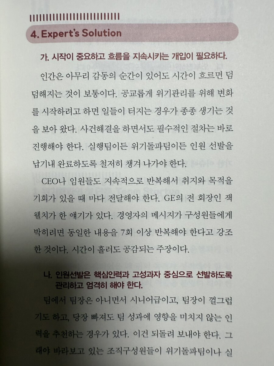 모든 조직의 역사는 위기의 연속이다. 외부 환경의 급변, 내부 역량의 부족, 그리고 예측할 수 없는 시장의 변화는 언제든 기업을 위협한다. 평온한 시간이 흐르다가도 갑자기 찾아오는 위기 앞에서 조직이 어떻게 준비하고 대응하는가가 생존의 열쇠다. 위기관리의 본질은 예방과 빠른 대응이다. 하지만 많은 조직들이 위기에 처했을 때 공통적으로 범하는 실수가 있다. 바로 위기의식은 공유하면서도 구체적인 돌파 방안과 실행 프로세스는 모호하게 남겨두는 것이다. 이것이 바로 위기 상황에서 변화관리가 필요한 이유다.