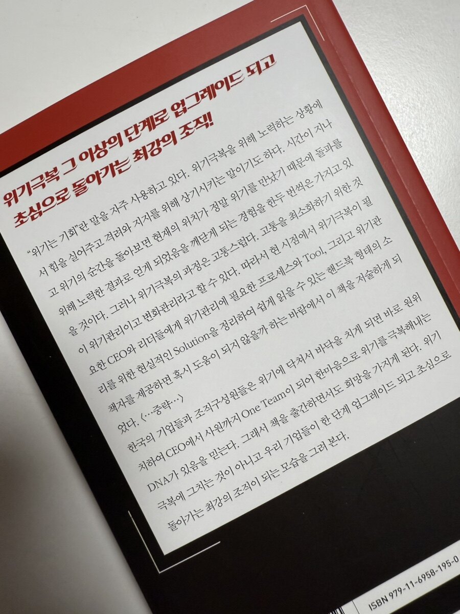 위기가 아닌 기업은 없다. 오늘의 성공이 내일의 성공을 보장하지 않는 시대에, 위기를 새로운 기회로 전환하는 능력이 조직의 지속 가능한 성장을 결정짓는다. 변화관리의 3단계 프로세스-Goal Holding, Tasking Working, Feedback-는 현실에서 검증된 실행 체계다. 각 단계별로 구체적인 실행 도구와 방법론을 활용하여 위기를 돌파하고, 궁극적으로는 위기에 강한 조직 문화를 형성해 나가야 한다. 인사가 만사라는 말처럼, 결국 모든 변화와 혁신은 사람에 의해, 사람을 통해 이루어진다. 위기 돌파의 핵심은 사람들의 마음을 움직이고, 행동을 변화시키는 데 있다. 이것이 바로 위기 돌파 조직의 본질이다.