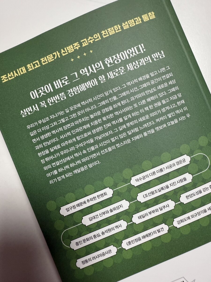 역사의 발자취를 따라서 가는 의미있는 여정이었다. 공간에 깃든 이야기들을 듣는 것은 참 재미있다. 오래된 성벽을 손으로 쓸어내릴 때, 그 돌 사이로 흐르는 시간의 흔적을 느낀 적이 있는가? 아니면 수백 년 전 선비들이 풍류를 즐기던 정자에 서서, 같은 풍경을 바라보며 그들의 생각에 잠겨본 적이 있는가? 우리가 무심코 지나치는 길모퉁이, 오래된 건물들, 마을 어귀의 고목 한 그루에도 사실은 수많은 이야기가 켜켜이 쌓여 있다. 신병주 교수의 <인물 따라 공간 따라 역사 문화 산책>은 그런 눈에 보이지 않는 역사의 실타래를 하나하나 풀어내는 여정으로 초대한다.