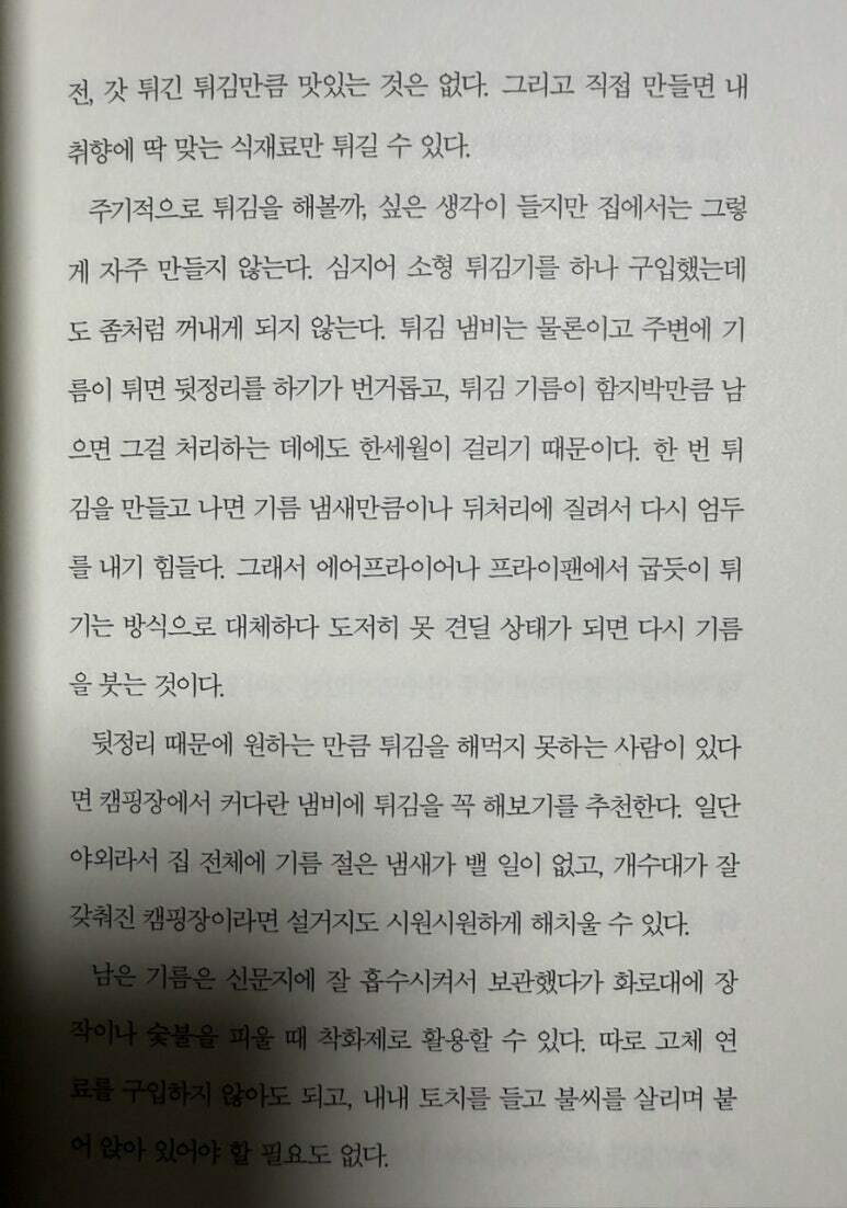 캠핑과 요리. 얼핏 보면 불편함의 조합처럼 보일 수 있습니다. 집에서도 번거로운 요리를 왜 더 불편한 야외에서 해야 할까요? 하지만 정연주님은 이 불편함 속에서 특별한 행복을 발견합니다. 봄날 캠핑에서는 신선한 죽순을 손질합니다. 배송 온 상자를 열면 마치 대나무숲에서 방금 따온 듯한 서늘한 냄기와 숲향이 느껴집니다. 도시의 좁은 주방에서는 상상도 못할 풍경이죠. "공간 넓고 바람이 솔솔 부는 캠핑장만한 장소가 어디 있을까!" 저자의 말처럼, 캠핑은 더 넓은 공간에서 요리하는 자유로움을 선사합니다. 여름에는 튀김의 즐거움이 있습니다. 집에서 하면 온 집안에 기름 냄새가 배지만, 캠핑장에서는 그런 걱정 없이 맘껏 튀겨 먹을 수 있죠. 남은 기름은 버리지 않고 화로대의 착화제로 활용하는 지혜도 배웁니다. 또한, 해산물 요리도 캠핑에서는 더욱 특별합니다. 쓰레기 봉지를 뚫고 온 집안에 비린내를 풍기는 해산물도 캠핑에서는 기꺼이 요리할 수 있으니까요. 가을 캠핑의 묘미는 빵 굽기입니다. 장작불 옆에서 빵을 굽는 낭만을 누립니다. 특히 팥양 도넛은 캠핑에서도 쉽게 만들 수 있는 별미로 소개됩니다. 일상 속에서는 미처 발견하지 못했던 대체 재료의 발견이 캠핑 요리의 묘미이 기도 합니다. 겨울 캠핑에서는 따뜻한 필리 치즈 스테이크와 달 마크니 커리가 기다립니다. 추운 날씨에도 화목 난로에 그릴을 올려놓고 뭉근하게 끓이는 커리는 몸과 마음을 따뜻하게 해줍니다. 눈 내리는 캠핑장에서 마늘 버터를 바른 난을 구워 먹으면, 마치 다른 나라에 온 듯한 착각도 들죠.