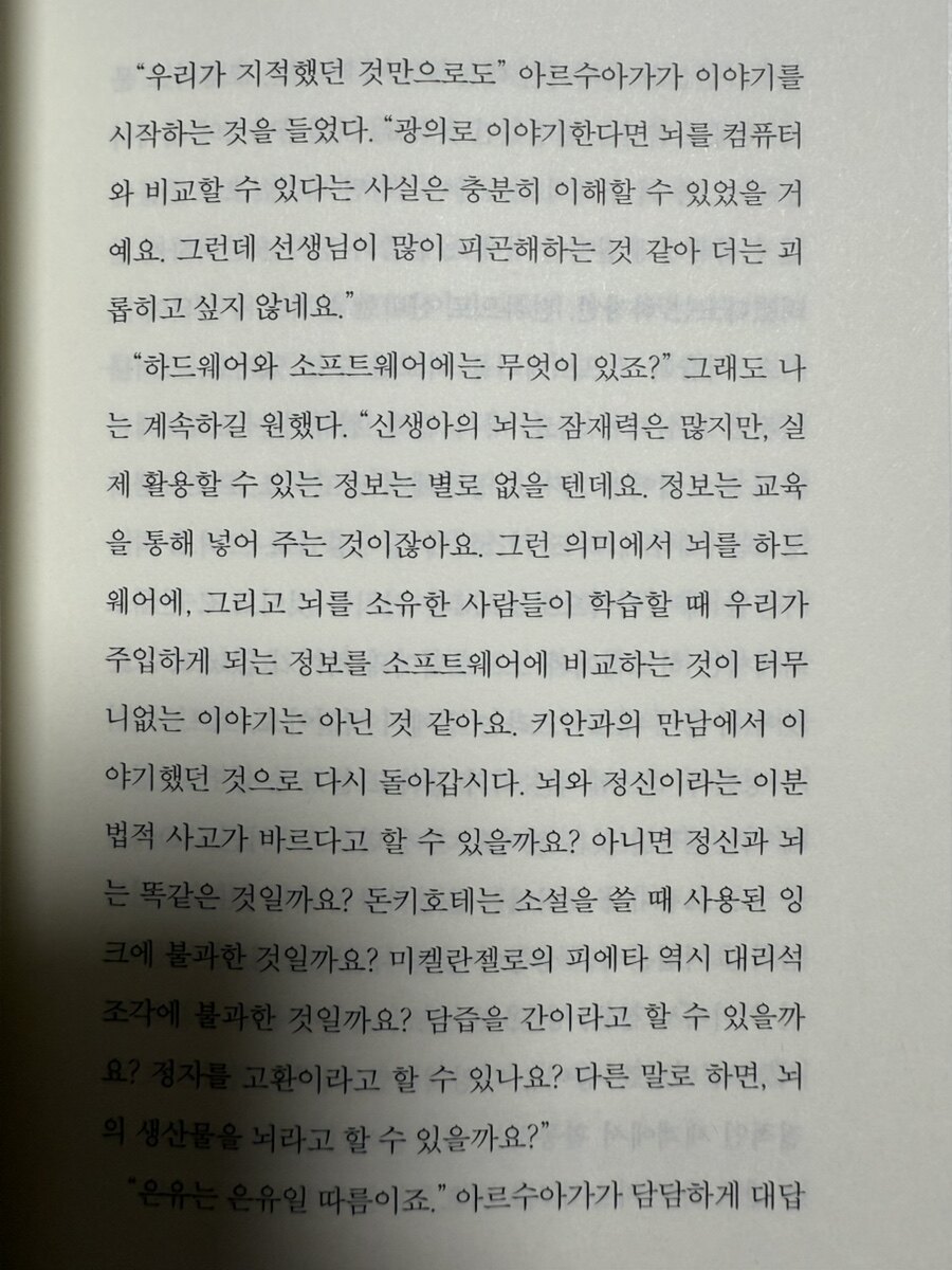 아르수아가는 컴퓨터 비유를 통해 정신과 뇌의 관계를 설명하려 한다. 그의 관점에서 정보는 항상 물질적 기반을 필요로 한다. 컴퓨터의 소프트웨어가 하드디스크나 메모리 칩과 같은 물리적 매체에 저장되는 것처럼, 인간의 생각과 기억도 뇌의 신경 회로에 물리적으로 저장된다는 것이다. 그러나 이 비유에는 한계가 있다. 컴퓨터와 달리, 인간의 뇌에서는 하드웨어와 소프트웨어의 구분이 명확하지 않다. 뇌는 정보를 저장하면서 동시에 그 구조 자체가 변화한다. 신경가소성(neuroplasticity)이라 불리는 이 특성은 뇌가 경험에 따라 물리적으로 재구성된다는 것을 의미한다. 이는 인간의 사고와 기억이 단순히 정적인 저장소에 기록되는 데이터가 아니라, 뇌의 구조와 기능에 지속적으로 영향을 미치는 동적인 과정임을 시사한다. 더욱이, 정보가 의미를 갖기 위해서는 해석자가 필요하다. 컴퓨터의 데이터는 그것을 읽고 해석하는 시스템 없이는 의미가 없다. 마찬가지로, 뇌에 저장된 정보도 그것을 의식적으로 경험하는 '누군가' 없이는 의미가 없다. 그렇다면 그 '누군가'는 정확히 무엇인가? 이 질문은 우리를 의식의 수수께끼로 다시 이끈다.