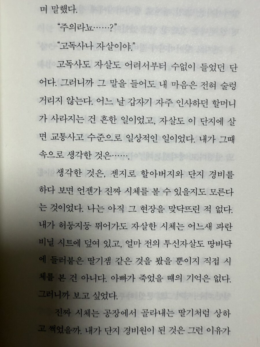 소설은 낡은 아파트에서 피어나는 삶의 이야기를 담담하게 이야기 한다. 주인공 미카게는 60년이 넘은 오래된 아파트 단지에서 언니 나나미와 단둘이 살고 있다. 이 아파트는 '자살 명소'로 알려져 있을 만큼 죽음이 가까운 공간이다. 세 살 때 아버지를 잃고, 어머니는 어린 두 자매를 남겨둔 채 집을 떠났다. 천식을 앓는 미카게는 학교에서의 따돌림으로 야간 학교를 다니며, 빵 공장에서 아르바이트를 하고 있다. 언니 나나미는 어린 동생을 보살피기 위해 학업을 포기하고 '밤일'을 하며 생계를 유지한다. 미카게의 세상은 좁고 제한적이다. 오래된 단지, 빵 공장, 야간학교에서 만나는 몇 안 되는 친구들이 전부다. 그런 그녀에게는 하나의 특별한 꿈이 있었다. 바로 '언젠가 직접 두 눈으로 시체를 보는 것'이다. 죽음에 대한 두려움보다는 호기심이 더 큰 미카게는 삶보다 죽음에 더 가까이 있는 듯하다.