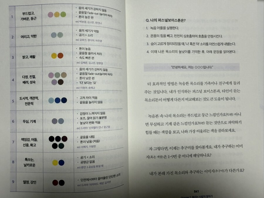 말은 세상을 설득하는 것이 아니라, 나를 설득하는 데서 먼저 시작되어야 한다. 말은 곧 믿음이고, 그 믿음은 태도를 바꾸고, 태도는 삶을 바꾼다. 발표나 인터뷰처럼 중요한 순간에도 결국 말은 마음의 준비에서 시작된다. 완벽한 말을 준비하는 것보다, 따뜻한 말 하나를 진심으로 전하는 것이 훨씬 더 큰 울림을 만든다. 숫자를 넣어 구체적으로 말하고, 실수는 솔직하게 웃으며 넘길 줄 아는 여유는 결국 진심 어린 말에서 온다. 사람들은 말 잘하는 사람보다, 말로 위로해주는 사람을 더 오래 기억한다. 저자는 자신의 경험을 사례로 여러가지 스킬을 잘 설명하고 있다. 매력자본이라 할 수 있는 자신만의 목소리와 이를 위한 연습 방법을 그림과 함께 설명하고 있다. 나만의 퍼스널 보이스톤을 찾기위한 스킬을 설명해 준다. 나만의 보이스를 찾기위한 방법이 재미있었다. 또한 대화하면서 필요한 리액션의 3요소(경청,동의/공감 리액션..), 아이컨택의 자연스럽게 하기위한 3개의 꼭지점 등 실전에서 바로 쓸 수 있는 스킬들을 한아름 제안해주고 있다. ^.^