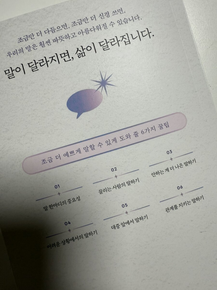 갈등은 말에서 시작되지만, 위로도 말에서 온다. 말로 다툼이 일어난다면 말로 풀어야 한다. 말은 행동보다 빠르게 마음을 전할 수 있는 유일한 도구다. 그리고 그 도구는 연습을 통해 다듬어진다. 칭찬은 구체적으로 해야 하고, 감정 표현은 있는 그대로 해야 한다. “고마워, 네가 있어서 다행이야” 같은 말은 시간이 지나도 기억에 남는다. 자기 자신에게도 예쁜 말을 건네는 연습이 필요하다. 셀프 대화는 자신감을 만든다. “나는 괜찮아, 잘할 수 있어”라는 반복된 자기 암시는 불안을 이겨내는 말의 힘이 된다.