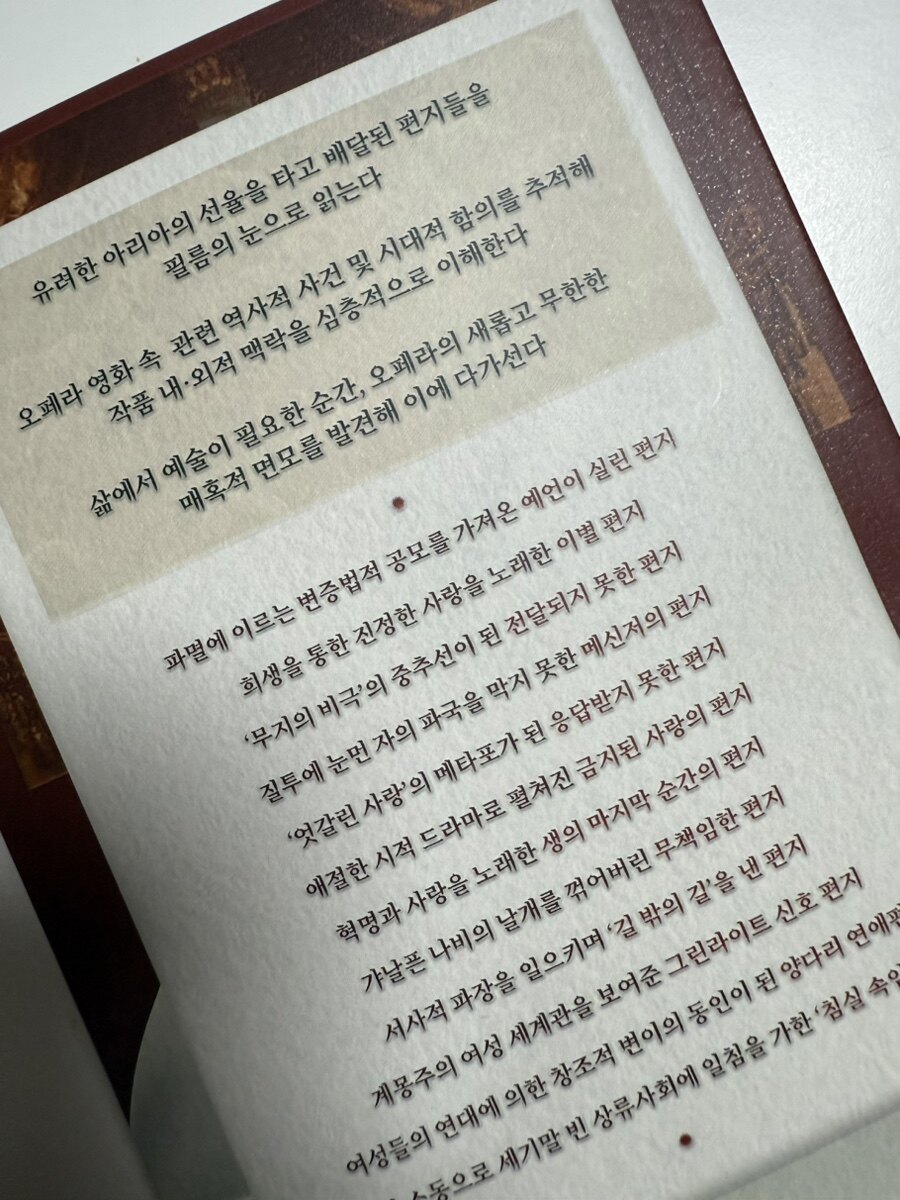 ​오페라 영화 속 편지를 통한 접근은 우리에게 오페라의 복잡한 감정과 주제를 새로운 시각으로 이해할 기회를 제공할 것 같다. 또한, 원작 문학과의 비교를 통해 오페라의 역사적 사건과 시대적 맥락을 심층적으로 이야기하여 작품의 내적 및 외적 요소를 이해하는 데 도움을 주고 있다. 오페라에 대한 흥미로운 접근 방법인 것 같다. 책은 먼저 오페라의 배경이 되는 역사적 사실들을 간략하게 이야기 한다. 오페라를 보다 정확하게 이해하기 위해서는 역사적 배경을 이해하는 것이 도움을 줄 것이다. 책은 또한 오페라의 각 장에서의 상세한 이야기의 흐름을 상세히 전달한다. 마치 오페라 공연을 눈앞에서 보는 듯한 감정이 느껴지기도 한다. 각 오페라에서의 편지에 대한 의미와 오페라 영화에 대해서 간략하게 이야기를 펼친다. 재미있는 구성인 것 같다.