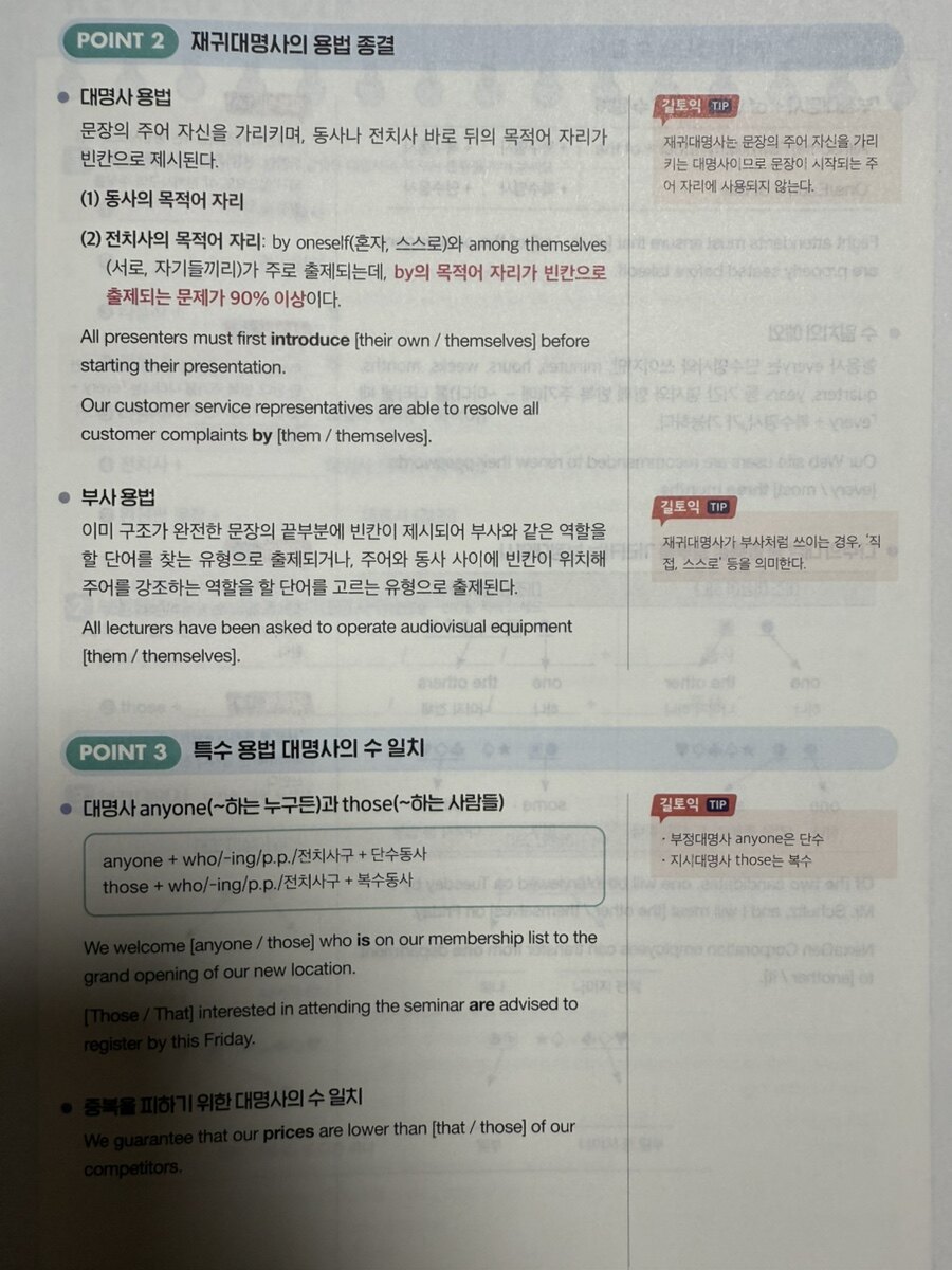​이 책은 일주일 만에 문법을 정리할 수 있도록 설계되었기 때문에, 단기간에 집중적으로 학습하는 것이 중요하다. 하루에 한 개의 챕터를 학습하는 방식으로 진행하면, 단기간 내에 문법을 정리하고 실전 감각을 익힐 수 있다. 책을 직접 정리하고 표시하면서 학습할 수 있도록 되어 있다. 주요 개념을 스스로 적으며 학습하는 방식은 암기 효과를 극대화한다. 특히 REVIEW NOTE 부분을 활용하여 빈칸을 채워가며 학습하면 더욱 효과적일 것 같다. 보통의 문법서는 여러 번 반복해서 학습해야 하지만, 저자는 실시간 이해와 암기가 가능하도록 구성되어 있다. 문법 용어를 최소화하고, 쉽게 이해할 수 있도록 설명하고 있기 때문에 N회독 없이도 충분히 학습이 가능하다. 유료 강의를 병행하면 학습 효과를 더욱 극대화할 수 있을 것 같다. 강의를 통해 주요 개념을 확실히 익히고, 실전에서 적용할 수 있는 문제 풀이 전략을 배울 수 있기 때문이다. 책에 포함된 최신 기출 변형 모의고사를 적극 활용하여 실전 감각을 익히는 것이 중요할 것 같다. 시험 직전에 이 모의고사를 풀어보면서 자신의 실력을 점검하면 효과적이지 않을까 생각해 본다.