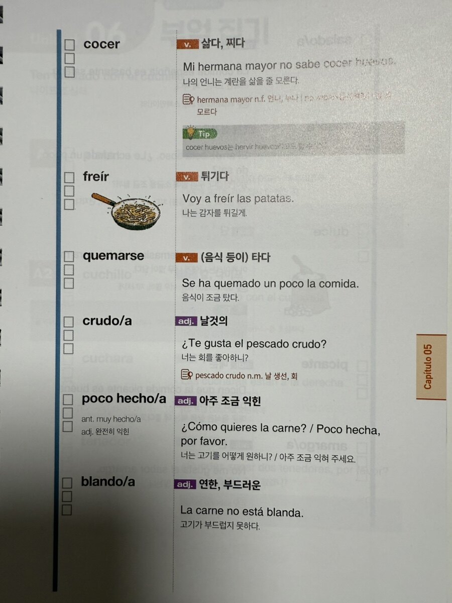 각 Capitulo(챕터)마다 ‘실력을 보여 줘!’ 코너를 통해 다양한 일상 회화 상황을 제공하고 있다. 이 코너를 활용하면 학습자가 단어만을 외우는 것이 아니라, 실제 대화 속에서 문장을 익힐 수 있어 실전 회화 능력을 높이는 데 도움이 된다. 특히, 외국어를 학습할 때 가장 어려운 부분 중 하나인 자연스러운 문장 구사 능력을 기를 수 있다는 점에서 큰 장점이 있다. 또한, 각 챕터마다 제공되는 연습문제를 통해 학습자가 얼마나 단어를 제대로 익혔는지 점검할 수 있도록 되어 있다. 단어 암기는 한 번 외운다고 끝나는 것이 아니라, 반복적인 복습이 필수적이다. 이를 고려하여 본문에서 학습한 단어를 다시 한 번 확인하고, 체크박스를 활용해 반복 학습할 수 있도록 구성되어 있다.