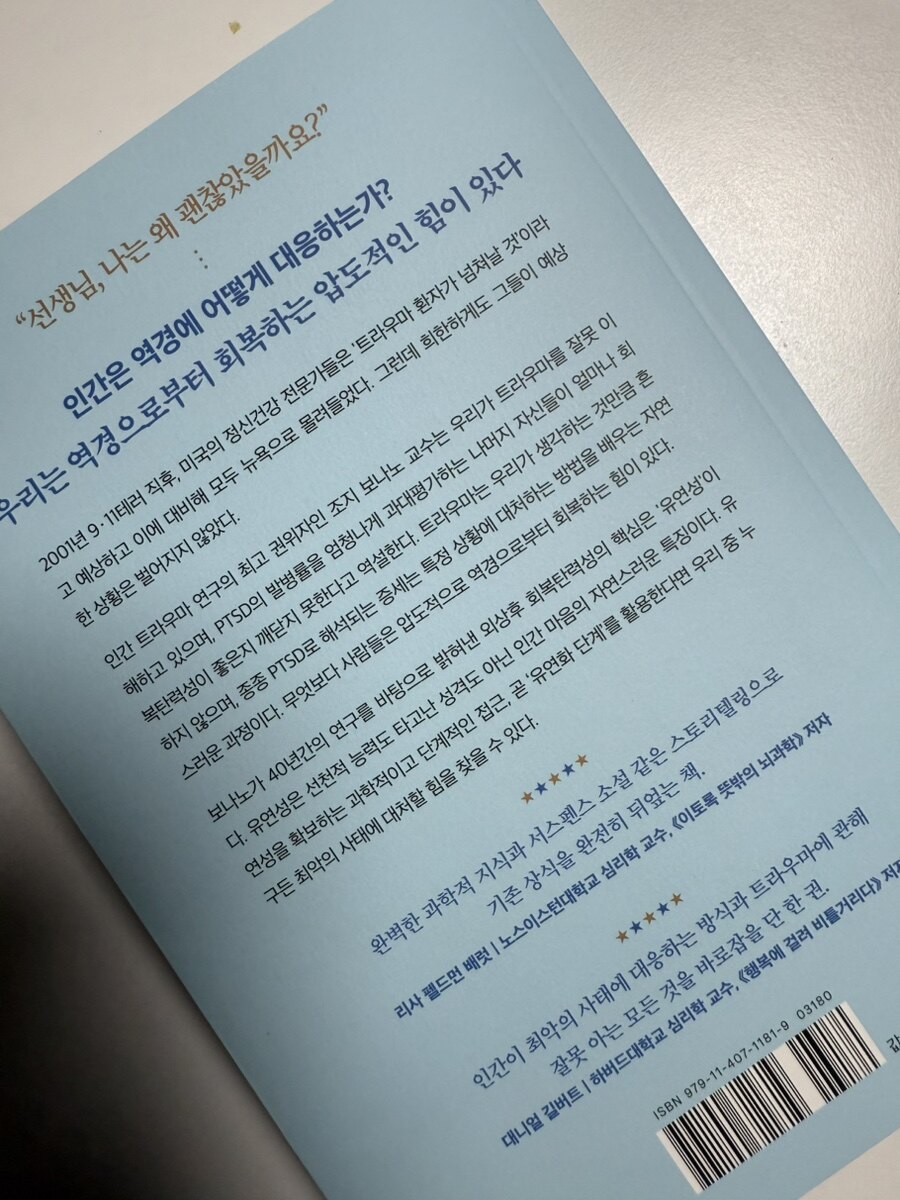 현대 사회는 빠르게 변화하고 복잡한 환경에서 이루어지고 있다. 기술의 발전, 경제적 불확실성, 사회적 갈등 등 다양한 요소들이 개인의 삶에 영향을 미치고 있다. 이러한 환경 속에서 우리는 종종 예기치 않은 상황에 직면하게 되며, 이는 우리의 정신적, 정서적 안정성을 위협한다. 따라서 회복 탄력성은 현대 사회에서 더욱 필요하게 되었다. 우리는 현대 사회는 정보의 홍수 속에서 살아가고 있다. 소셜 미디어의 영향, 직장 내 경쟁, 그리고 경제적 불황 등 다양한 요인들이 개인에게 스트레스를 가중시키고 있다. 이러한 스트레스는 만성적인 불안감과 우울증을 초래할 수 있으며, 회복 탄력성이 부족한 사람에게는 더욱 큰 부담으로 작용한다. 회복 탄력성이 강한 사람은 이러한 스트레스 상황에서도 유연하게 대처하고, 감정적으로 회복할 수 있는 능력을 갖추고 있을 것이다. 현대 사회는 예측할 수 없는 변화가 빈번하다. 직업의 변화, 기술의 발전, 글로벌 환경문제 등은 우리의 미래에 대한 불확실성을 키운다. 이러한 불확실성 속에서 회복 탄력성은 우리가 새로운 상황에 적응하고, 변화에 맞서 싸울 수 있는 힘을 제공해 줄 것이다. 직장에서의 변화나 이직을 고려할 때, 회복 탄력성이 높은 사람은 이러한 변화에 대해 긍정적인 시각을 유지하고, 새로운 도전에 도전할 수 있는 자신감을 줄 것이다. 이번에 이러한 회복탄력성에 대해서 본격적으로 이야기 해 주는 신간을 읽을 기회를 얻었다. 조지 보나노의<결국 회복하는 힘>이었다.