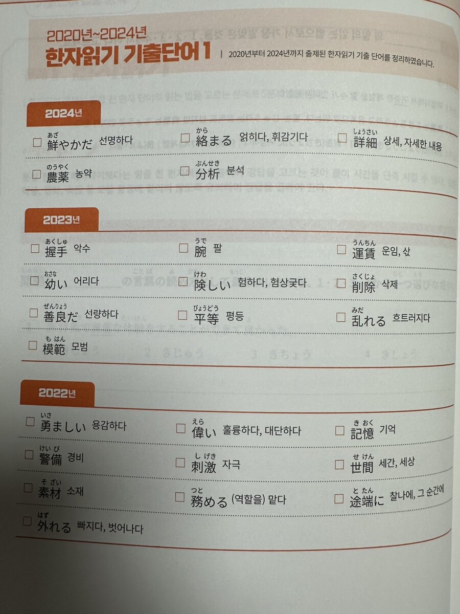 실전 모의고사 부분은 실제 시험과 유사한 느낌을 받아서, 시험 준비에 큰 도움이 될 것 같았다. 해설이 상세하게 제공되어 있어, 단순히 정답을 확인하는 것을 넘어 왜 정답인지에 대한 이해를 높일 수 있었다. 이는 부족한 부분을 보완하고, 실력을 다지는 데 매우 유익할 것이라 생각했다. 부록으로 제공되는 30일 체크북은 필요 정보를 간결하게 정리한 단어장으로, 시험 준비에 큰 도움이 될 것 같았다. 단어와 함께 핵심 문법도 함께 적혀 있어, 마지막 복기용으로 매우 유용할 것이라는 생각이 들었다. 가볍게 들고 다니며 반복 학습할 수 있다는 점이 특히 마음에 들었다. 책을 처음 훑어보았을 때, 내용이 알차고 구성도 뛰어나서 매우 만족스러웠다. 특히 글씨체와 색상이 깔끔하게 디자인되어 있어 눈이 편안했다. 한자와 관련된 단어들을 정리한 부분도 매우 유익하게 느껴졌다. 이 책 하나만으로도 JLPT N2 합격을 위한 충분한 준비가 가능할 것 같다는 자신감이 생겼다.
