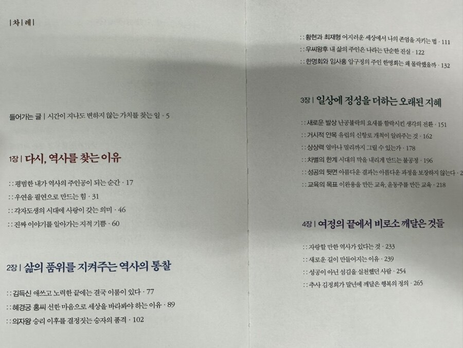 책은 총 6장으로 구성되어 있으며, 각 장은 독특한 주제를 다루고 있다. 첫 번째 장에서는 역사 속의 '미스터리'를 다룬다. 피라미드의 건축 비밀, 아틀란티스 전설, 나폴레옹의 죽음 등, 역사에 남아 있는 수수께끼들을 통해 독자들은 과거의 신비로움을 느낄 수 있다. 두 번째 장에서는 역사의 흐름을 바꾼 인물들을 재발견한다. 구국의 영웅이나 세기의 명의, 그리고 왕들의 비애와 같은 이야기는 개인의 선택이 역사에 미친 영향을 보여준다. 그들의 결정과 행동이 어떻게 시대를 변화시켰는지를 탐구하는 중요한 키워드가 된다. 세 번째 장에서는 결정적 순간들을 다룬다. 실수, 선택, 전쟁, 쿠데타 등은 역사적 전환점이 되는 사건들로, 이 장을 통해 독자들은 역사가 어떻게 형성되는지를 더욱 명확하게 이해할 수 있다. 이러한 순간들은 현재와 미래에도 영향을 미치는 중요한 요소들이다. 네 번째 장에서는 조금 더 일상적인 주제들을 탐구한다. 고대의 아르바이트, 화장실 문화, 지도 제작, 언어의 발전, 보물 발굴 등은 역사 속에서 우리가 잘 알지 못했던 흥미로운 사실들을 제공한다. 다섯 번째 장에서는 '최초의 역사' 또는 의외의 역사적 사실을 안내한다. 동물의 역사, 금의 가치, 형벌의 변천사, 미신의 기원, 법의 발전 등은 우리가 일상에서 당연하게 여기는 것들이 어떻게 형성되었는지를 보여주면서, 독자들에게 새로운 시각을 제공한다. 마지막으로 역사를 제대로 이해하는 방법에 대해 설명한다. 역사학자의 이면, 문명의 기원 이론, 아리아인 이야기 등은 역사적 사실을 분석하고 해석하는 데 필요한 비판적 사고를 강조한다. 역사적 사건을 단순히 수용하는 것이 아니라, 그 이면에 있는 복잡한 맥락을 탐구하도록 유도한다.
