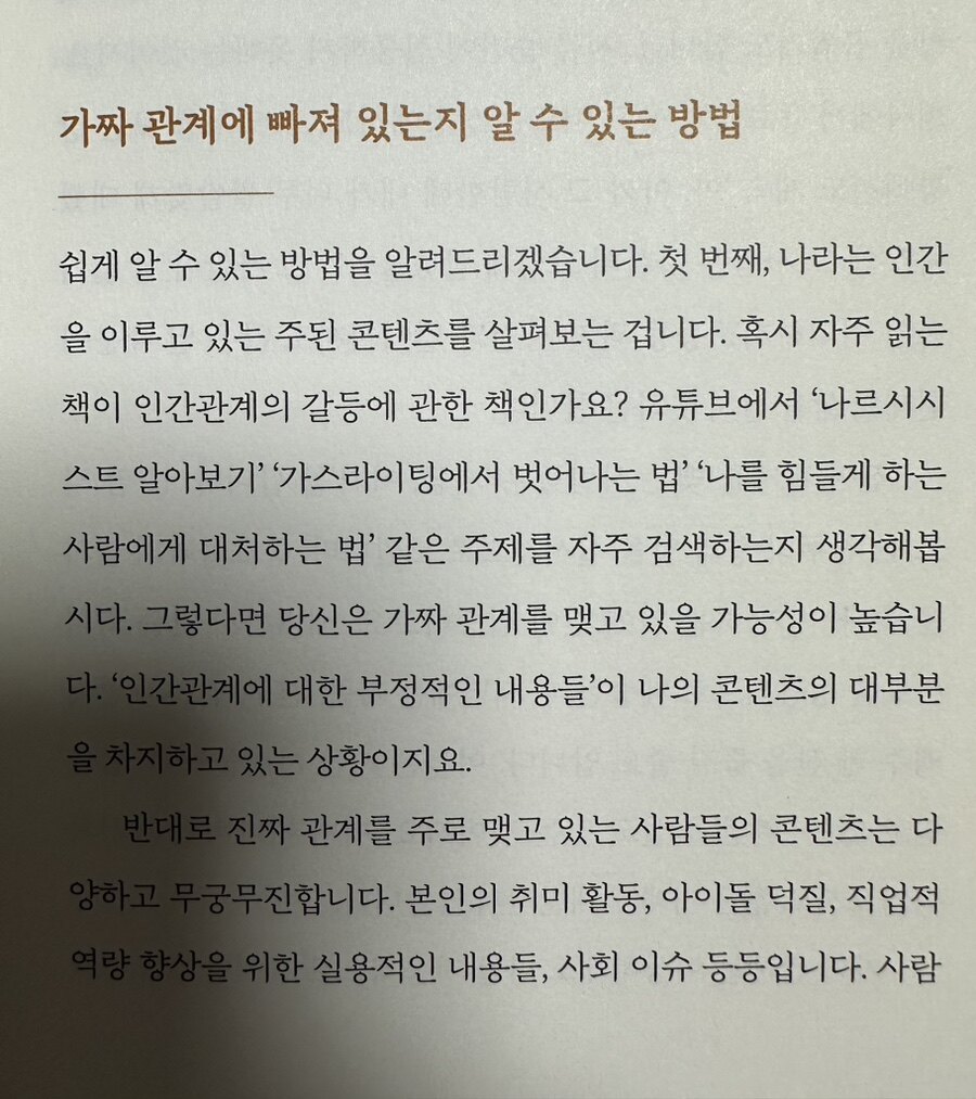 저자는 가짜 관계에 끌려다니지 않고 내가 행복한 진짜 관계를 맺는 법에 대해 이야기 해준다. 다양한 사례를 통해 인간관계에서 어떻게 진짜 관계를 형성하고 유지할 수 있는지를 독자들에게 친절하게 알려준다.