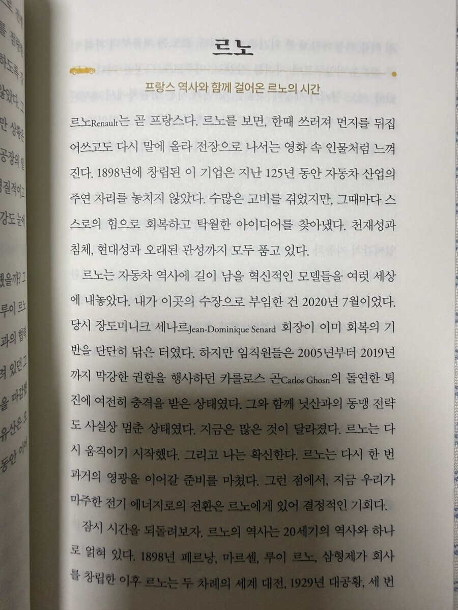 루카 드 메오(Luca de Meo)의 <자동차에 관한 거의 모든 이야기>는 자동차 애호가들을 위한 사전 형식의 에세이집이다. 현재 르노 그룹의 CEO로 재직 중인 저자는 30년 이상 자동차 업계에서 활동하며 피아트, 폴크스바겐, 세아트 등 유럽의 주요 자동차 브랜드를 거쳐온 독특한 이력을 가지고 있다. 이탈리아에서 시작해 독일, 스페인, 그리고 현재 프랑스까지 유럽 전역의 자동차 문화를 체험한 저자만이 쓸 수 있는 책이라 할 수 있다. 책은 사전 형식을 취하고 있다. 'ㄱ'부터 시작해 'ㅎ'로 끝나는 이 책은 자동차 백과사전만이 아니라, 자동차를 둘러싼 인간의 이야기, 문화, 그리고 사회적 의미를 탐구하는 인문학적 접근을 시도한다 할 것 같다.
