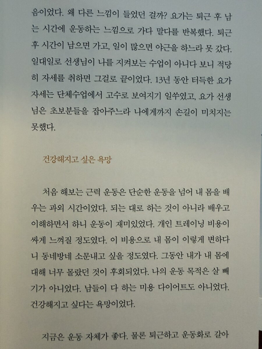 우리는 언제부터인가 몸과 마음을 분리된 것으로 여기며 살아왔다. 머리로는 생각하고, 가슴으로는 감정을 느끼고, 몸으로는 그저 일상을 수행할 뿐이라고. 하지만 어느 순간 깨닫게 된다. 몸이 보내는 신호들이 물리적 반응만이 아니라는 것을 알게된다. 근육 하나하나가 살아있는 언어를 가지고 있으며, 우리의 마음이 그 언어를 번역해내고 있다는 사실을 말이다. 운동이라는 행위는 표면적으로는 건강을 위한 선택처럼 보인다. 체중을 줄이고, 근육을 키우고, 체력을 기르는 것. 하지만 그 안으로 들어가면 전혀 다른 세계가 펼쳐진다. 바벨을 들어 올리는 순간, 플랭크 자세를 유지하는 시간, 런닝머신 위에서 숨을 고르는 찰나. 이 모든 순간들이 몸과 마음 사이의 은밀한 대화로 가득하다. 이번에 읽은 서은희님의 <몸이 묻고 마음이 답하다>를 읽으면서 운동에 대한 생각을 다시 해 본다. 신성한 접근 방법으로 생각하는 운동에 대해서 저자의 경험을 공유해 본다. ^.^