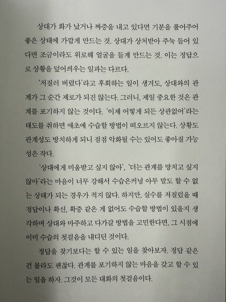 역설적이게도, 실수가 전혀 없는 관계보다는 실수를 함께 겪고 극복한 관계가 더 깊고 견고하다. 완벽한 예의만 주고받는 표면적 관계에서는 서로의 진짜 모습을 알기 어렵다. 반면 실수와 실망, 오해와 화해를 거친 관계는 서로의 인간적 면모를 이해하게 되고, 그만큼 더 깊은 신뢰를 쌓을 수 있다. 이는 개인적 성장 차원에서도 마찬가지다. 실수를 통해 자신의 한계를 인식하고, 그것을 개선해나가는 과정에서 진정한 소통 능력이 길러진다. 처음부터 완벽했던 사람보다, 많은 시행착오를 겪으며 배워온 사람이 더 유연하고 포용적인 대화 파트너가 되는 이유다.