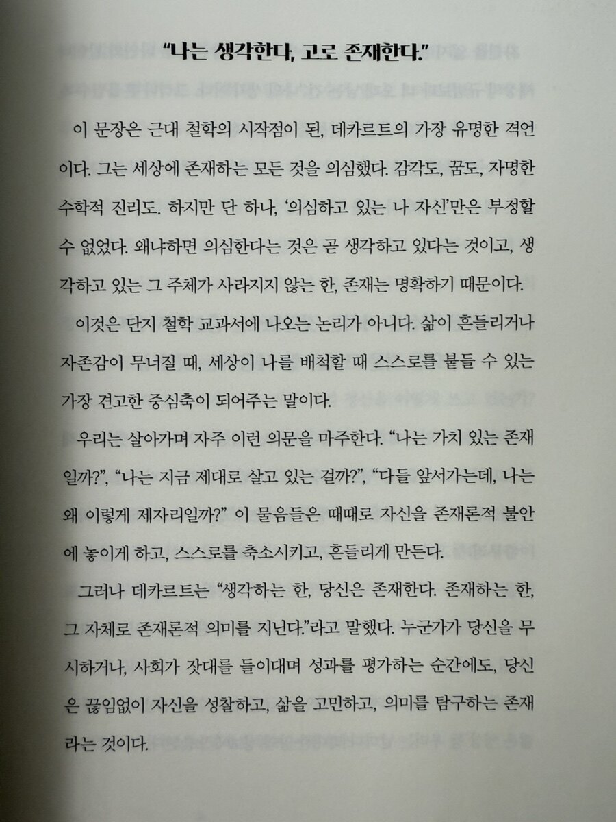 데카르트의 "나는 생각한다, 고로 존재한다"는 논리적 명제만이 아니다. 이는 모든 인간이 자신의 존재 의미를 스스로 확인해야 한다는 철학적 선언이다. 현대를 살아가는 우리에게 이 말이 주는 의미는 더욱 깊다. 끊임없이 변화하는 사회 속에서 우리는 자주 자신을 잃어버린다. SNS의 완벽해 보이는 타인의 삶과 비교하며 자존감을 잃고, 성과 중심의 사회에서 자신의 가치를 의심한다. 이때 필요한 것이 바로 철학적 성찰이다. 나의 존재 자체가 이미 충분한 가치를 지니고 있으며, 타인의 기준이 아닌 나만의 기준으로 삶을 평가해야 한다는 깨달음 말이다. 철학은 우리에게 존재론적 확신을 준다. 아무리 세상이 나를 평가절하해도, 내가 사유하고 성찰하는 한, 그 자체로 의미 있는 존재라는 사실을 일깨워준다. 이런 철학적 토대 없이는 외부의 평가에 일희일비하며 흔들리는 삶을 살 수밖에 없다.