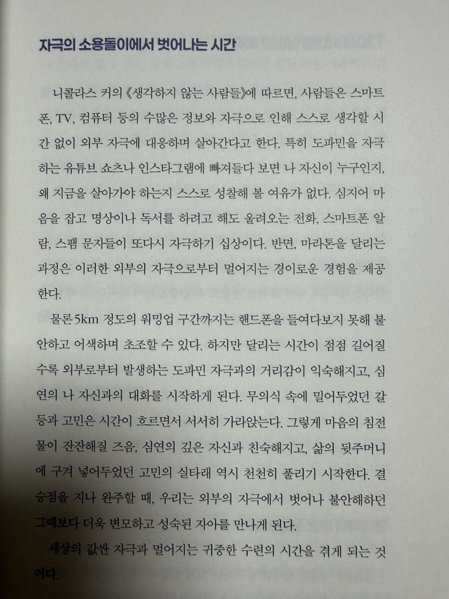 ​마라톤의 후반부에서 일어나는 신체적 변화는 마치 인생의 축소판 같다. 탄수화물이 고갈되고 지방을 에너지로 사용하기 시작하면서, 몸은 무거워지고 정신은 흐려진다. 감정의 기복이 극에 달하고, 포기하고 싶은 유혹이 끊임없이 찾아온다. 하지만 바로 그 순간이 진정한 시험대다. 극한의 고통을 뚫고 목적지를 향해 달려갈 때, 우리는 내재된 의지를 발견하게 된다. 그동안 몰랐던 자신의 잠재력을 깨닫고, 불가능해 보였던 일들도 해낼 수 있다는 자신감을 얻게 된다. 나는 이런 순간을 경험해보고 싶다. 단순히 운동으로서의 마라톤이 아니라, 삶의 태도를 바꾸는 계기로서의 마라톤을 말이다. 완주 후에 느끼게 될 자신감과 자존감은 일상의 모든 영역에 긍정적인 영향을 미칠 것이다.