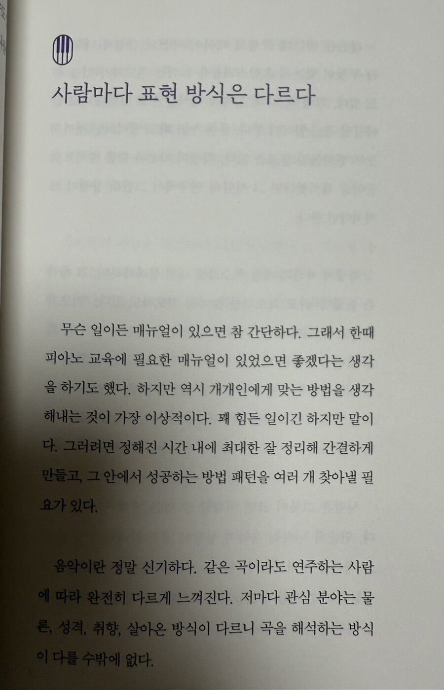 어느 조용한 오후, 한 권의 책이 내 마음에 파문을 일으켰다. <기적의 피아니스트 교육법>이라는 제목 뒤에 숨겨진 이야기는 음악 교육을 넘어선 인생의 철학이었다. 시각 장애를 가진 피아니스트 츠지이 노부유키가 반 클라이번 국제 피아노 콩쿠르에서 우승하기까지의 여정. 그리고 그를 12년간 지도한 스승 카와카미 마사히로의 헌신적인 교육 철학. 이들의 이야기는 음악을 넘어 삶 자체에 대한 깊은 성찰을 불러일으킨다. 우리는 모두 각자의 악보를 가지고 살아간다. 때로는 음표들이 선명하게 보이고, 때로는 흐릿하게 느껴진다. 하지만 중요한 것은 그 악보를 어떻게 해석하고, 어떤 선율로 연주해내느냐이다. 노부유키의 이야기는 우리에게 말한다. 장애는 한계가 아니라 다른 방식의 가능성이라고 다시한번 이야기 한다.