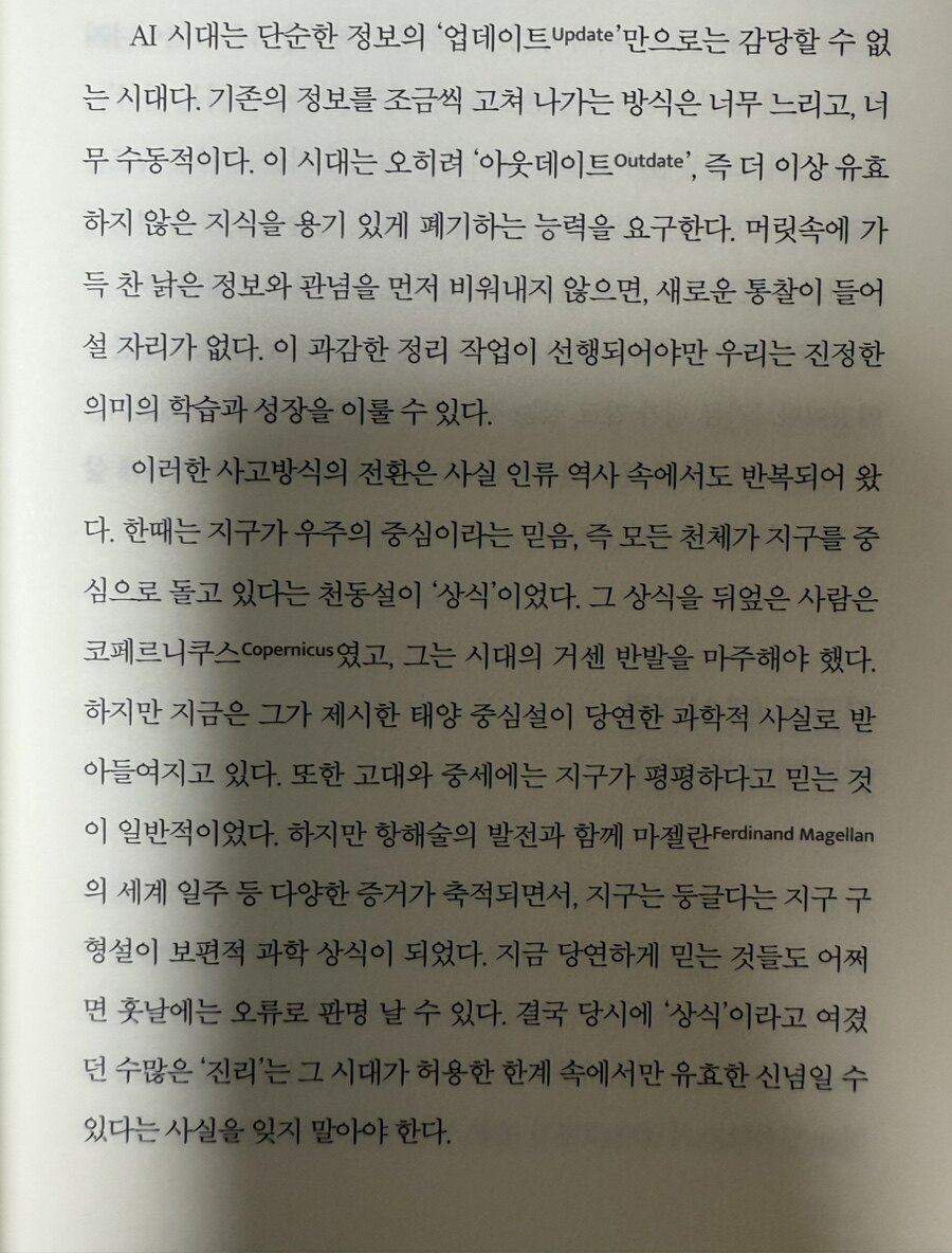 박용후님은 생각의 주도권을 확보하기 위한 핵심 원리를 제시합니다. 이 원리들은 AI 시대에 필요한 인간의 사고방식을 재정립하는 데 중요한 이정표가 될 것 같습니다. 먼저, 질문은 사고의 시작점입니다. 우리는 오랜 시간 정답을 찾아왔지만, 이제는 정답을 좇는 습관에서 벗어나 먼저 질문을 던지는 용기가 필요합니다. 좋은 질문 하나가 수백 개의 정답보다 더 큰 힘을 갖는다고 말합니다. 하나의 질문이 수많은 가능성을 열고, 깊이 있는 탐구를 이끌어낼 수 있습니다. AI가 아무리 많은 답을 제공해도, 그 답을 유의미하게 활용할 수 있는 질문을 던지지 못한다면 우리는 그저 정보의 홍수 속을 헤맬 뿐입니다. AI는 인간의 사고방식을 그대로 반영하는 존재입니다. AI의 결과물은 사용자의 질문의 질에 비례할 것입니다. 즉, 피상적인 질문에는 피상적인 답이 돌아오고, 깊이 있는 질문에는 깊이 있는 통찰을 얻을 수 있다는 것입니다. AI를 통해 얻는 정보의 가치는 결국 우리가 던지는 질문의 깊이에 달려 있습니다. 저자가 지속적으로 이야기 하고 있는 원칙, 관점을 디자인하라는 원칙은 정보 과잉 시대에 특히 중요합니다. 무수히 쏟아지는 정보 속에서 길을 잃지 않기 위해서는 정보를 걸러내고 해석하며, 자신만의 의미를 부여할 수 있는 '틀을 설계하는 능력 ' 이 필요합니다. 기존의 틀을 의심하고, 새로운 시각으로 관점을 재설계하는 과정은 사고의 무기가 되어 우리를 통찰력 있는 존재로 만듭니다. 우리는 익숙한 것들을 당연하게 받아들이는 경향이 있지만, 진짜 사고는 바로 그 당연함을 의심하는 순간 시작됩니다. 기존의 방식이나 고정관념에 질문을 던질 때 비로소 새로운 아이디어와 해결책이 도출될 수 있습니다. AI가 기존 데이터를 바탕으로 최적의 답을 찾아낼 수는 있지만, 전혀 다른 차원의 질문 을 던져 기존의 틀을 깨는 것은 인간의 몫입니다. 마지막으로, Al를 넘어서는 질문력을 가져야 합니다. 기계와 경쟁하지 않고 인간만의 고유한 영역을 지키는 방법을 제시합니다. AI는 답을 주는 데 탁월하지만, 질문을 설계하는 것은 오직 인간의 몫입니다. 인간은 AI가 할 수 없는 '왜'라는 근원적인 질문, '무엇을 놓쳤는가'라는 비판적인 질문, 그리고 '어떻게 더 나아질 수 있는가'라는 창의적인 질문을 던질 수 있습니다. 이러한 질문력을 통해 우리는 Al를 초월하고, 인간 고유의 가치를 증명할 수 있습니다.