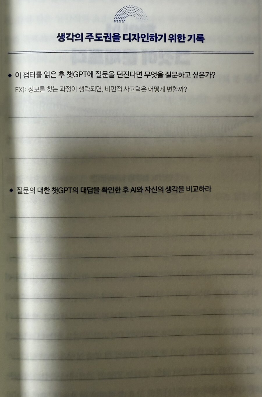 실질적으로 질문력을 키울 수 있는 구체적인 실천법들을 고민해 봅니다. 매일 한 가지씩 근본적인 질문 던지기를 통해서, 자신의 삶과 직업, 사회 현상에 대한 깊이 있는 성찰을 할 수 있을 것입니다. "나는 지금 무엇을 위해 일하고 있는가?, "이 문제의 본질은 무엇인가?"와 같은 질문을 스스로에게 던지는 습관을 통해 사고의 깊이를 더할 수 있습니다. 매일 마주하는 일상적인 문제나 업무를 다른 시각에서 바라보는 훈련해 보는 것도 좋을 것입니다. 회사에서 일어나는 고객 불만을 처리해야 할 문제로만 보는 것이 아니라, 서비스 개선 을 위한 중요한 피드백으로 재해석하는 시도하는 행위는 사고의 유연성을 길러주고, 문제 해결 능력을 향상시켜 줄 것입니다. 또한 궁금한 점이 생겼을 때 바로 검색 엔진에 의존하기보다, 잠시 멈춰 서서 스스로에게 '왜 이런 현상이 발생했을까?, 내가 이 상황에서 놓치고 있는 중요한 부분은 없을까?'와 같은 질문을 먼저 던지는 습관을 들이는 것입니다. 이러한 비판적 사고는 정보를 능동적으로 지식을 구성하는 데 도움을 줄 것입니다. AI가 제공하는 정보는 매우 유용하지만, 그 정보가 항상 정확하거나 완벽한 것은 아닙니다. 따라서 Al의 답변을 맹목적으로 믿기보다, 그 내용의 사실 여부를 확인하고, 어떤 맥락에서 도출된 답변인지 비판적으로 검토하는 자세가 필요합니다. 이는 AI를 현명하게 활용하는 동시에, 자신의 판단력을 유지하는 중요한 방법입니다. 마지막으로, 질문 기록 노트를 만들어 보는 것도 좋을 것 같습니다. 자신이 어떤 질문을 주로 던지는지, 어떤 질문에서 막히는지, 어떤 질문이 새로운 아이디어를 이끌어냈는지 등을 기록하고 주기적으로 검토하는 것은 메타인지 능력을 향상시키는 데 큰 도움이 됩니다. 자신의 질문 습관을 파악함으로써 강점은 더 욱 발전시키고, 약점은 보완할 수 있습니다.