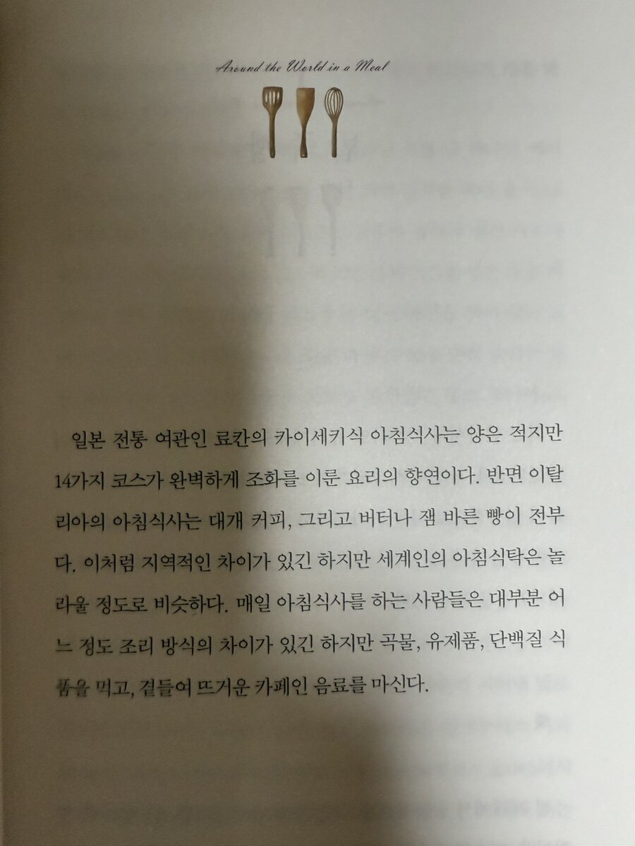 아침 식사는 각 문화권의 특색을 고스란히 담아내는 거울과도 같습니다. 앤더슨은 '한 끼 식사로 전 세계를 여행하다‘라며 시리얼, 계란, 베이컨, 페이스트리처럼 우리에게 익숙한 아침 식사 메뉴뿐만 아니라, 다른 나라에서 전통적으로 즐겨 먹는 아침 식사들을 소개하며 그 다양성을 보여줍니다. 예를 들어, 중국인들은 오랫동안 쌀죽(jook)을 아침 에너지원으로 즐겨왔습니다. 따뜻하고 부드러운 쌀죽은 속을 편안하게 해주고 하루를 시작하는 데 필요한 에너지를 제공합니다. 중동 지역에서는 페타 치즈, 올리브, 무화과, 오이 플래 터, 혹은 라브네(labneh)를 곁들인 신선한 플랫브레드가 아침 식탁에 오릅니다. 신선한 재료와 풍부한 맛이 특징인 이 아침 식사는 그 지역의 기후와 식문화를 잘 보여줍니다. 일본 전통 여관인 료칸의 가이세키식 아침 식사'는 양은 적지만 14가지 코스로 완벽하게 조화를 이룬 요리의 향연으로, 일본 특유의 섬세함과 미학이 담겨 있습니다. 반면 이탈리아의 아침 식사는 대개 커피 한 잔과 버터나 잼을 바른 빵이 전부인 경우가 많습니다. 간소하지만 향긋한 커피와 달콤한 빵은 이탈리아인들의 여유로운 아침을 상징합니다. 이처럼 지역마 다 아침 식사의 형태는 매우 다양하지만, 놀랍게도 세계인의 아침 식탁에는 몇 가지 공통점이 존재합니다. 매일 아침 식사를 하는 사람 들은 대부분 조리 방식의 차이는 있지만 곡물, 유제품, 단백질 식품을 섭취하며, 여기에 뜨거운 카페인 음료를 곁들입니다. 이는 전 세계적으로 아침 식사가 에너지 공급과 정신적 각성을 위한 중요한 역할을 해왔음을 보여주는 증거입니다.