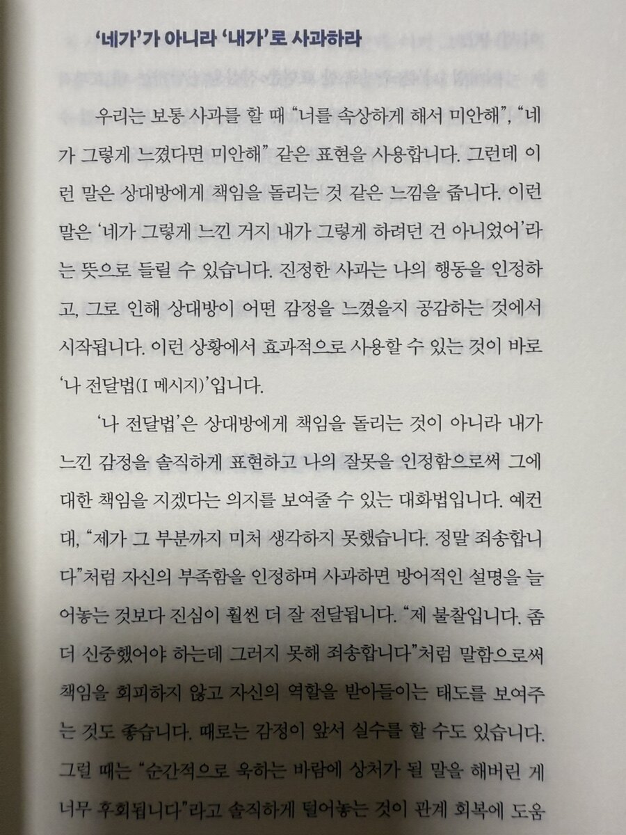 솔직히 우리는 살아가면서 내 기분이 왜 이런지, 내가 뭘 원하는지 잘 모를 때 많다. 저자는 바로 여기서부터 시작하라고 한다. 모든 감정은 결국 '욕구'에서 비롯된다. 예를 들어, 짜증이 난다면 그건 뭔가 충족되지 않은 욕구가 있다는 신호다. 내 감정의 뿌리인 욕구를 정확히 알아야 비로소 상대방에게 내가 뭘 원하는지 명확하게 전달할 수 있다. 어떤 상황에서 내 감정이 훅 올라올 때, "아, 내가 지금 뭘 바라고 있지?" 하고 스스로에게 물어보는 연습이 필요하다. 내 욕구를 파악했으면, 그 상황을 감정적으로 평가하지 말고 객관적으로 관철하는 게 중요하다. 그리고 이걸 상대방에게 전달할 때는 구체적이고, 긍정적이고, 현재형으로 말하는 게 핵심이다. 예를 들어, 맨날 늦게 와서 짜증 나!" 대신 "네가 약속 시간보다 10분 늦게 와서 내가 기다리는 동안 좀 불안했어. 다음부턴 제시간에 와주면 좋겠어" 이런 식으로 말하는것이다. 저자는 '말 잘하는 것'과 '잘 말하는 것'을 확실히 구분한다. 유창한 말솜씨는 그냥 '말 잘하는 것'일 뿐이고, ‘진짜 잘 말하는 것'은 말의 구조가 탄탄하고, 맥락이 명확하고, 무엇보다 듣는 사람과 생각과 감정을 얼마나 공유하고 연결되느냐에 달려있다. 화려한 수사법보다 진심으로 소통하려는 태도가 더 중요하다. 나도 이 부분에서 많이 공감을 하였다. 그동안 말솜씨에만 신경 썼던 건 아닌가 싶어서...