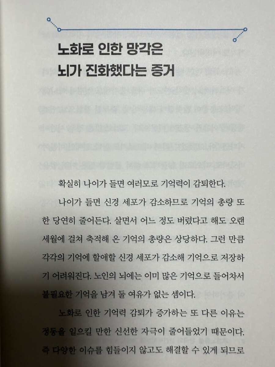 "기억력이 아니라 망각력이 뇌를 살린다"는 저자의 주장과 같이, 이제 우리는 잊는 것을 두려워할 필요가 없다. 오히려 불필요한 정보는 과감히 지우고, 기억보다 망각을 훈련하는 습관을 들이는 것이 중요하다. 수면, 운동, 예술 활동을 통해 뇌를 회복시키고, 감정 중심으로 기억을 선택하고 저장하는 연습을 꾸준히 한다면 우리의 뇌는 더욱 젊고 건강해질 것이다. 정보가 넘쳐나는 이 시대에, 무한한 기억력보다는 중요한 정보를 선별하고 관리하며, 과잉 정보 속에서 우리의 사고력을 지키는 것이야 말로 가장 핵심적인 전략이 아닐까 생각한다. 뇌를 정리하면 창의성, 집중력, 판단력이 살아나고, 우리는 더욱 풍요롭고 의미 있는 삶을 살아갈 수 있을 것이다.