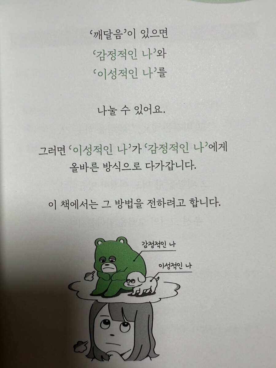 이 책의 가장 독창적이고 핵심적인 접근법은 바로 우리의 내면을 '감정적인 나'와 '이성적인 나'라는 두 개의 캐릭터로 나누어 설명하는 것이다. 저자는 우울, 불안, 분노와 같은 감정들을 억지로 누르거나 없애야 할 문제적 대상으로 보지 않는다. 오히려 '감정적인 나'는 우리의 솔직한 마음을 대변하는 어린아이와 같다고 말한다. 이 어린아이는 때로는 토라지고, 때로는 상처받고, 때로는 떼를 쓰기도 한다. 하지만 이 아이의 감정은 너무나 순수하고 솔직한 우리의 본모습이기도 한다. 그렇기에 '이성적인 나'가 현명한 어른이 되어, 토라지고 상처받은 '감정적인 나'를 이해하고, 다독이고, 올바른 방향으로 이끌어야 한다고 강조한다. 마치 어깨 위에 앉은 작고 귀여운 캐릭터들처럼, 책 속의 아기자기한 삽화들은 이 개념을 직관적으로 이해시켜 주는데, 덕분에 감정에 압도당하는 대신 한 걸음 떨어져 나의 상태를 객관적으로 바라볼 수 있게 돕는다. 저자는 '이성적인 나'에게 '자신감'을 더해야 한다고 말한다
