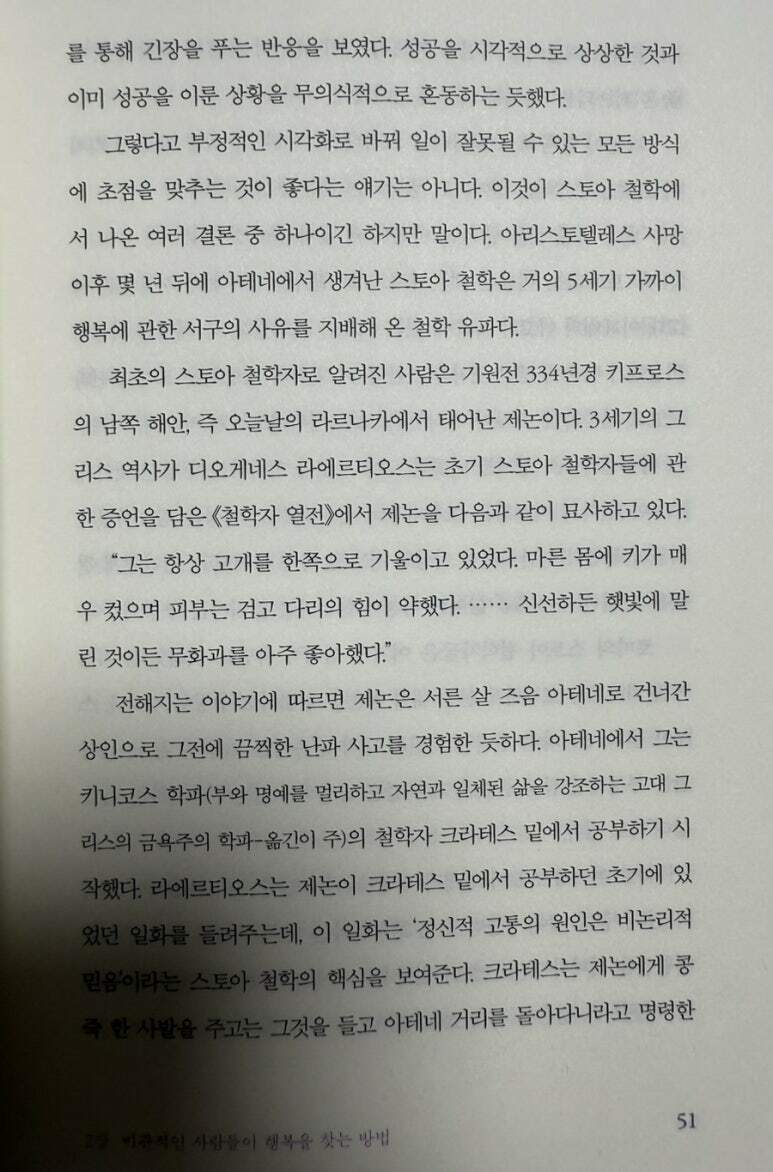고대 그리스와 로마의 금욕주의 철학자들은 상황이 얼마나 나빠질지 항상 생각하는 것의 이점을 강조했다. 불교의 핵심에도 이 논리는 깊이 자리 잡고 있는데, 불교는 진정한 안정은 불안감을 거침없이 받아들이는데서, 즉 우리가 결코 확고한 기반 위에 서 있지 않다는 사실을 인식하는 데 있다고 가르친다. 상황이 얼마나 잘 될지 생각하는데 시간과 에너지를 쏟는 것은 대부분의 사람들의 목표 달성 의지를 실제로 약화시킨다는 사실이 밝혀졌다. 버크먼과 같은 자기 굴욕 연습을 시도해 본 사람들은 특별한 나쁜 일이 전혀 일어나지 않는다는 것을 알게 된다. 상상했던 최악의 시나리오는 정확하지 않았고, 심한 굴욕감을 느끼지 않았으며, 자의식은 견딜만했다고 한다. 현대의 긍정 숭배는 종종 사람들에게 ”긍정적인 시각화“에 참여하도록, 즉 상황이 잘 풀린다고 상상하도록 권장한다. 우리를 행복하고, 동기 부여가 되고, 용감하게 만들어 준다고 한다. 그러나 안타깝게도 긍정적인 시각화는 효과를 발휘하지 못한다. 실험 결과에 따르면 성취를 상상하는 것만으로도 심리적으로 지나치게 만족감을 주는 것으로 나타났다. 사람들은 현실에서 목표를 달성하기도 전에 긴장을 풀기 때문이다.