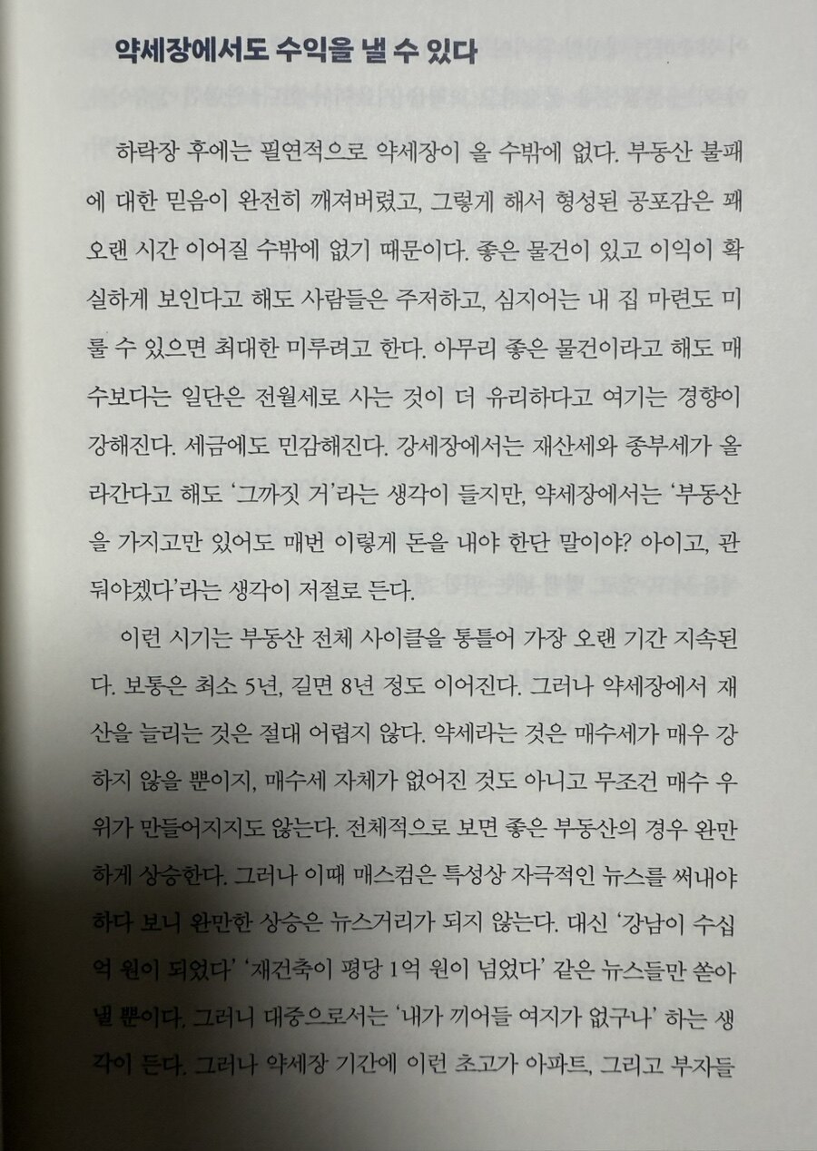 첫 번째 황금 로드맵으로 부동산 사이클링 기법이다. 이 전략의 목표는 아주 명확하다. ' 4년에 100% 수익률 달성 . 언뜻 들으면 허황되게 느껴질 수도 있지만, 저자는 이것이 ' 사이클 '을 이해하고 활용하면 충분히 가능하다는 것을 보여준다. 부동산 시장은 마치 계절처럼 ' 사이클 '을 가지고 움직인다. 강세장, 약세장, 그리고 하락장이 반복된다. 사이클링 기법은 바로 이 주기를 정확히 파악하고, 각 시장 상황에 맞는 진입과 회수 전략을 구사하는 것을 의미한다. 강세장에서는 과감하게 진입하고, 약세장에서는 다음 기회를 준비하며, 하락장에서는 저가 매수의 기회를 노리는 것이다. 즉, 시장의 흐름에 몸을 맡기는 것이 아니라, 흐름을 읽고 능동적으로 움직이는 전략이다.