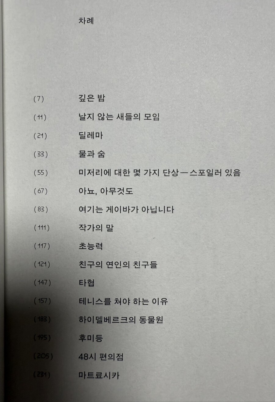 처음에 "아, 이분 감성 장인이네..." 하고 촉촉하게 읽다가 갑자기 "뭐지? 호러물이었나?" 하면서 등골 오싹해지고, 또 갑자기 "풋, 뭐야 이 병맛은? ㅋㅋㅋ" 하고 웃음 터집니다. 완전 롤러코스터 독서를 하는 느낌입니다. 책 한 권으로 이렇게 다양한 감정을 다 느끼게 해주는 책이라니, 진짜 대단한 소설 모음집입니다. 특히 '작가의 말'이 목차 때문에 중간에 툭 튀어나오는데, 진짜 대박 센스로 느껴졌습니다. 보통 작가의 말은 마지막에 그동안 읽어주셔서 감사합니다, 꾸벅하는 느낌인데, 갑자기 튀어나와서 "응? 벌써 끝인가? 아, 아니 네?" 하는 그 당황스러움과 유쾌함이 이 책의 정체성을 제대로 보여주는 것 같습니다. 목차를 가나다순으로 배치했다는 그 발상 자체가 이미 평범함을 거부하는 작가님의 성격이 드러나는 거 아닌가 싶습니다.
