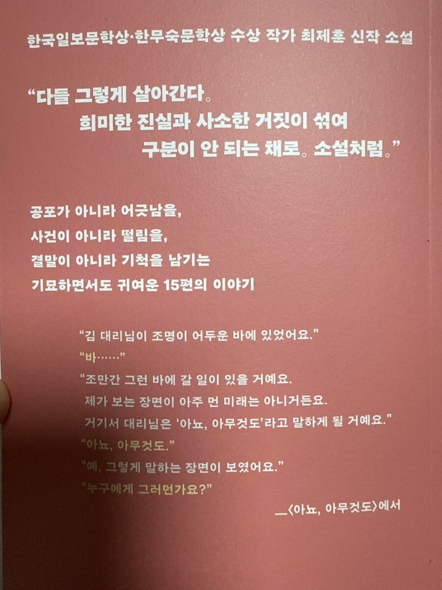 아, 35도를 넘는 무더위가 기승을 부리는 여름날 오후, 책을 읽고 나니 최제훈 작가님 책 완전 뽐뿌 오네요. ㅋㅋ 진짜 밤에 잠 안 올 때 그 묘한 감성, 딱 그거 아니겠어요? 밤은 괜히 우리 속마음 다 끄집어내는 재주가 있어요. 가볍게 생각했던 고민도 밤만 되면 막 거대한 돌개바람처럼 휘몰아쳐서 사람을 침대 위에서 뒹굴게 만들고••· 그 캄캄한 동굴이 사실은 내 마음속 어딘가였나 싶기도 하고.