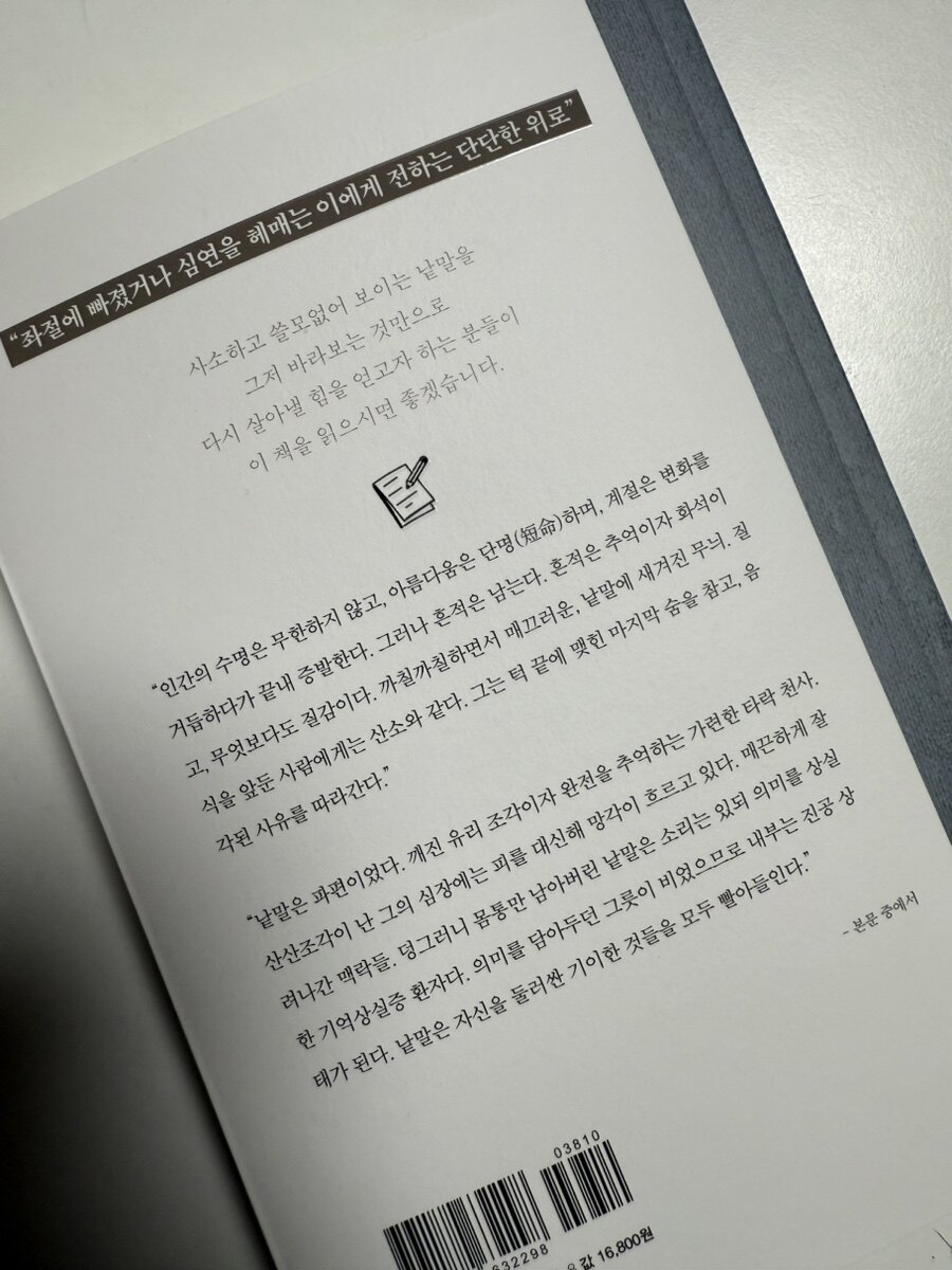 책을 읽는 동안 나는 그와 함께 느끼고, 생각하고, 다시 한 번 나의 삶을 돌아보게 되었다. 힘든 시간을 보내고 있는 나에게 깊은 위로가 되었고, 삶의 의미를 다시금 생각하게 해주었다. 지금 힘든 하루를 보내고 있는 누구에게나 이 책을 추천하고 싶다. 저자의 깊은 사유와 감정이 담긴 문장은, 우리 모두에게 필요한 위로가 될 것이기 때문이다. 그의 글을 통해 우리는 각자의 삶 속에서 공감하고, 또 다른 내일을 향해 나아갈 수 있는 힘을 얻을 수 있을 것이다.