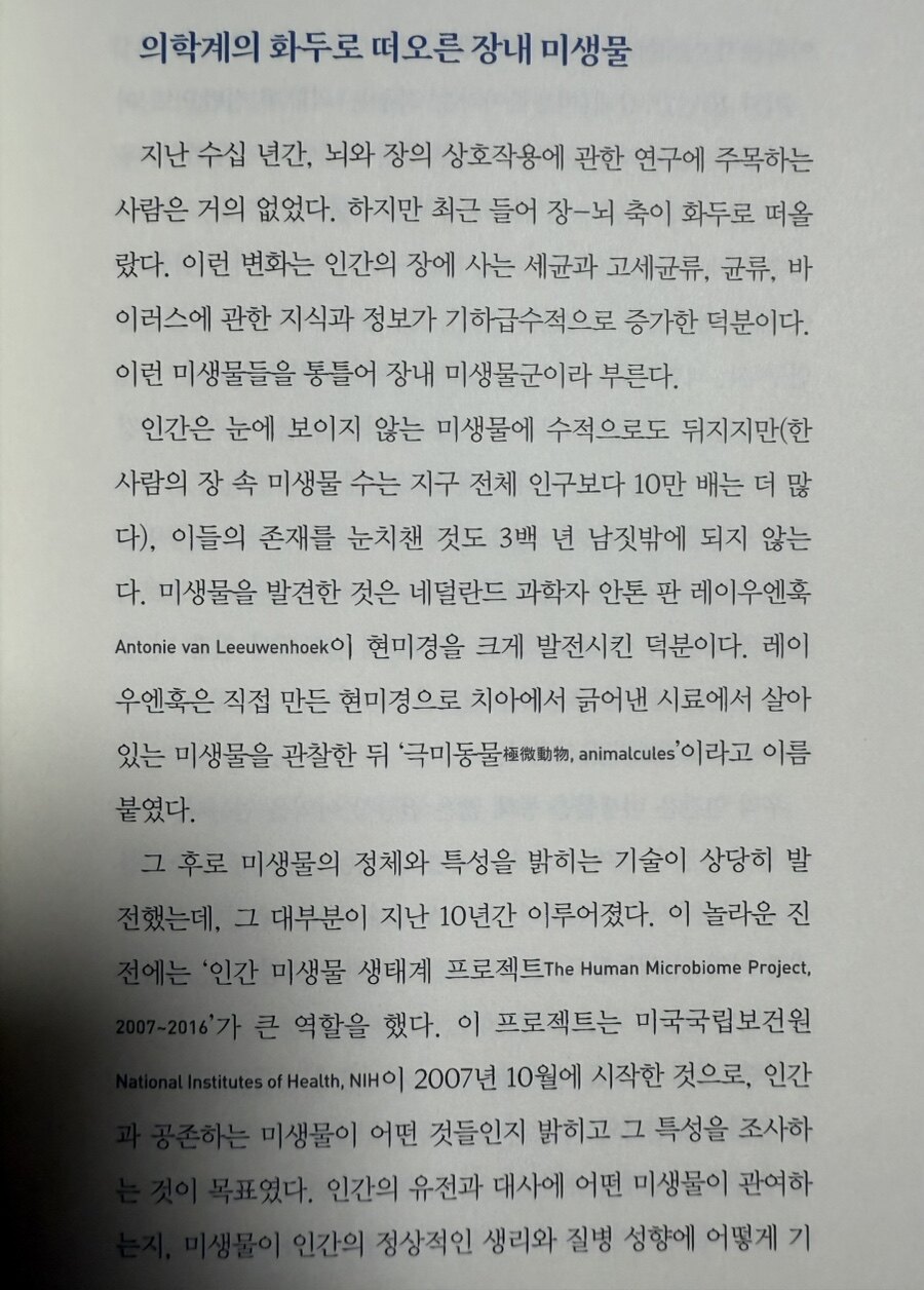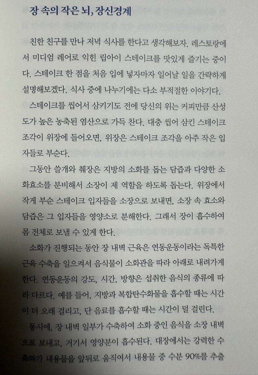 인간은 먹는 것도 중요하지만, 배변의 활동은 인간의 건강과 직결된다. 그런 만큼 배변을 위한 장의 역할은 우리의 건강에 대해 중요한 요소다. 이런 측면에서 인간의 생존에서 중요한 역할을 하는 장에 대해서 심도있게 논의하는 신간을 읽을 기회가 있었다. 에머런마이어의 <세컨드 브레인>이었다. 인간의 뇌와 같이 생명 유지에 필수적인 장에 대해서 알아보는 시간을 가졌다.