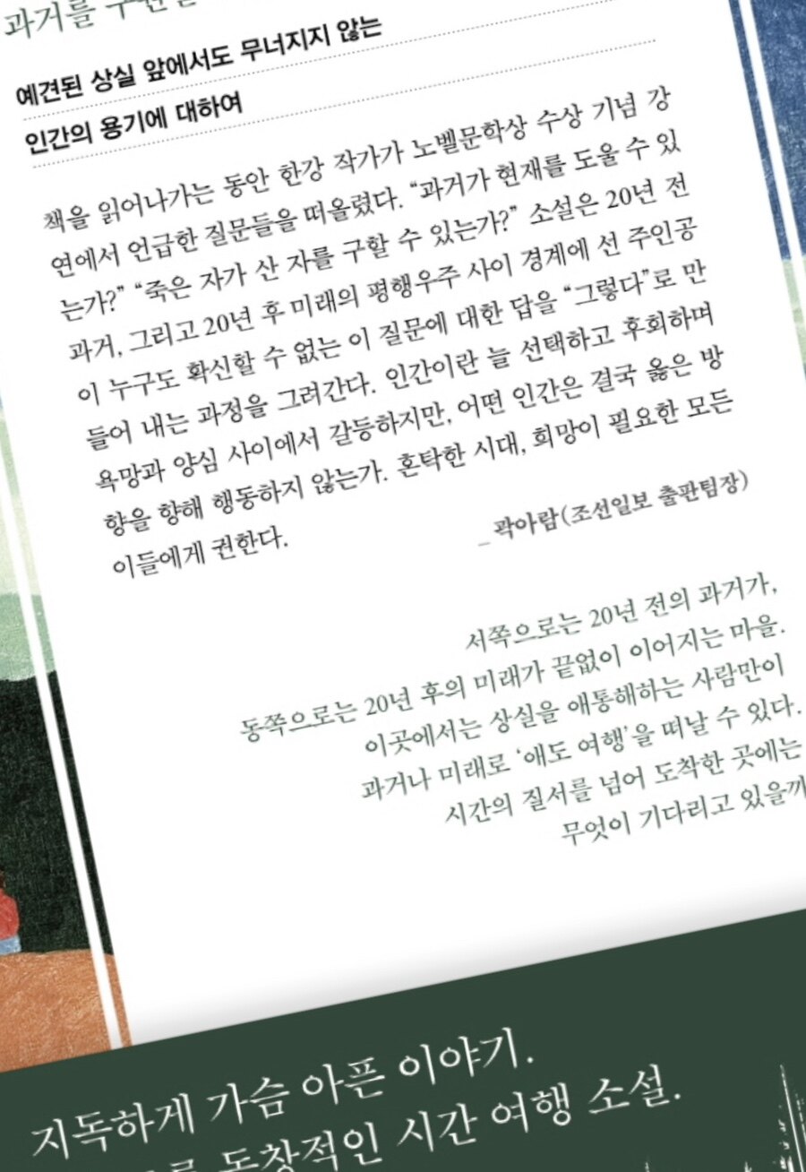 소설은 단순히 시간 여행을 다루는 이야기가 아니다. 이 작품은 우리가 감정을 어떻게 다루고, 선택의 순간에 어떤 길을 가야 하는지에 대한 깊은 철학적 질문을 던진다. 특히, "과거를 구원할 수 있는 건 오직 현재라는 것을" 마음속에 깊이 새겨 본다. 우리는 종종 과거를 바꾸고 싶은 욕망에 사로잡히곤 하지만, 결국 변화를 만들어내는 것은 현재를 살아가는 우리의 선택과 행동이라는 점을 깨닫는다. 소설에서 가장 인상적인 설정 중 하나는 ‘애도 여행’이라는 개념이 사회적으로 통제된다는 것이다. 슬픔을 느낄 자유가 누구에게나 주어져야 함에도 불구하고, 그마저도 허가를 받아야만 한다는 현실은 매우 슬프고 아이러니하다. 이는 현대 사회에서도 종종 느끼는 감정의 억압과 유사한 측면이 있는 것 같다. 슬픔을 표현하기 위해서는 사회적 규범이나 제약에 따라야 하는 현실은 우리에게 많은 것을 생각하게 한다.