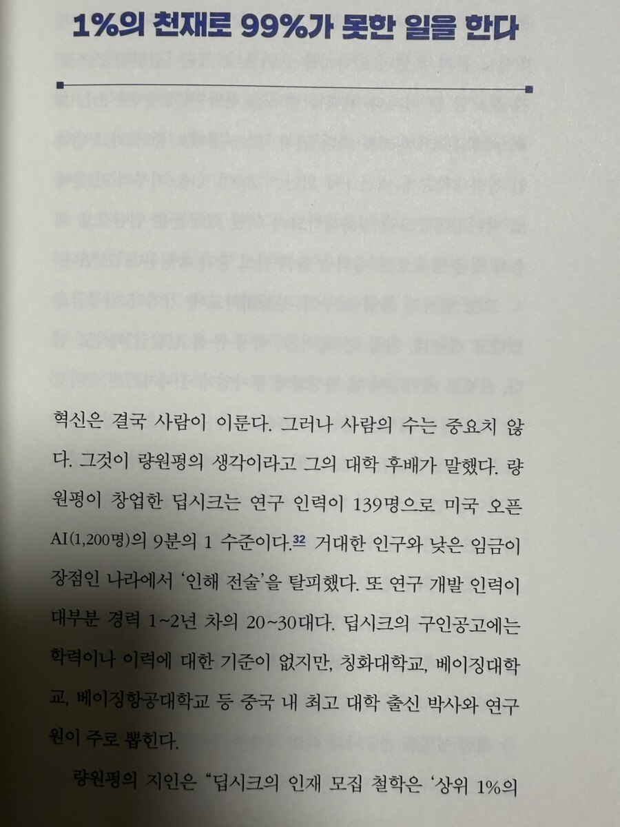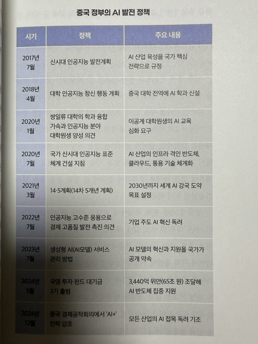 ​딥시크의 성공은 중국 정부의 전략적 지원과 긴밀하게 연결되어 있다. 중국은 AI 기술 개발을 단순한 산업 발전이 아니라 국가 안보 및 경제적 자립과 직결된 문제로 보고 있으며, 이에 따라 정부 차원의 지원과 규제 완화를 적극적으로 추진하고 있다. 특히, 정부는 인프라 투자, 연구개발 지원, 데이터 공유 등의 방식으로 AI 기업의 성장을 돕고 있으며, 딥시크 역시 이러한 지원을 적극적으로 활용해 급속도로 성장했다. 중국은 AI 인재 양성을 위한 체계적인 전략을 운영하고 있다. 딥시크의 연구개발 인력은 대부분 중국 내에서 교육받고 성장한 천재들로 구성되어 있으며, 해외 유학파 출신보다는 중국 내에서 직접 길러진 인재들이 주류를 이루고 있다. 이는 중국 정부가 AI 인재를 일찍부터 선발하고 지원하는 체계를 구축한 결과이다. 또한, 중국 사회 내에서 AI 및 기술 분야에 대한 선호도가 높아지면서, 젊은 인재들이 자연스럽게 AI 산업에 뛰어들고 있다. 스타트업 창업이 활발하게 이루어지고 있으며, 기술 분야의 성공이 사회적으로 높은 평가를 받으면서 인재들이 국내 AI 기업으로 몰리는 현상이 나타나고 있다.