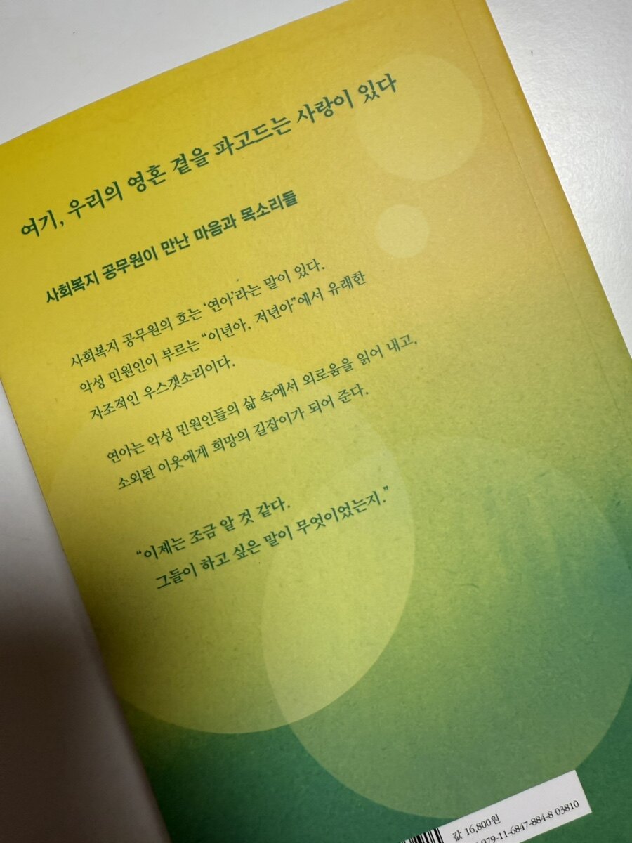 처음 이 책을 들었을 때, 제목을 보고는 제2의 인생을 시작한 사람의 이야기일 것이라 생각했다. '연아'라는 이름은 마치 새로운 결심을 다짐한 사람처럼 느껴졌고, 책 표지의 노란색과 초록색이 어우러진 모습은 긍정적이고 희망적인 느낌을 주었죠. 마치 사람들의 삶이 변화하는 순간을 다룬 에세이일 것처럼 생각하며 책을 펼쳤다. 그러나 책의 첫 장을 넘기고 나서야, 그 제목의 배경과 저자의 진심을 알게 되었다. '연아'라는 이름이 사회복지 공무원으로 일하면서 만난 민원인들에게 자조적으로 붙여진 별명에서 비롯된 것이라는 사실을 알게 되었을 때, 제 마음은 한순간에 무거워졌다.