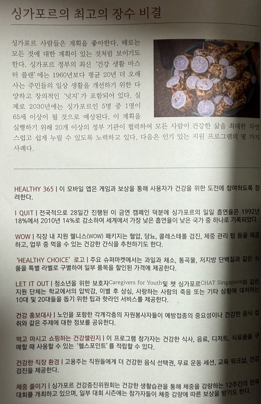 도시 지역이지만 블루존으로 소개된 싱가포르가 흥미로웠다. 블루존 싱가포르는 건강한 장수 지역으로 선정된 이유가 여러 가지 있다. 이 지역은 보행자 친화적인 환경, 건강식품에 대한 접근성, 공동체 생활의 장려, 그리고 노인 친화적인 병원 체계 등 다양한 요소들이 결합되어 있다. 먼저 싱가포르는 보행자 우선 신호체계와 잘 정비된 보행 로를 통해 시민들이 쉽게 걸어 다닐 수 있는 환경을 조성하고 있다. 이러한 설계는 도시 내에서의 이동을 용이하게 하여, 시민들이 자연스럽게 더 많은 걸음을 걷게 만든다. 특히, 정부는 자동차에 대한 과세를 부과하고 대중교통 이용을 장려하는 정책을 시행하여, 시민들이 대중교통을 이용할 수 있도록 유도하고 있다. 이러한 정책 덕분에 싱가 포르 시민들은 하루에 평균 1만 보 이상을 걷는 것으로 나타났다. 또한, 국가 걸음 도전(National Steps Challenge)' 프로그램을 통해 주민들이 매일 1만 보를 기록하면 지역 상점에서 사용할 수 있는 포인트를 지급하는 인센티브를 제공하고 있다. 이는 시민들이 건강을 유지하기 위해 적극적으로 걸음을 걷도록 유도하는 효과적인 방법이 되고 있다.