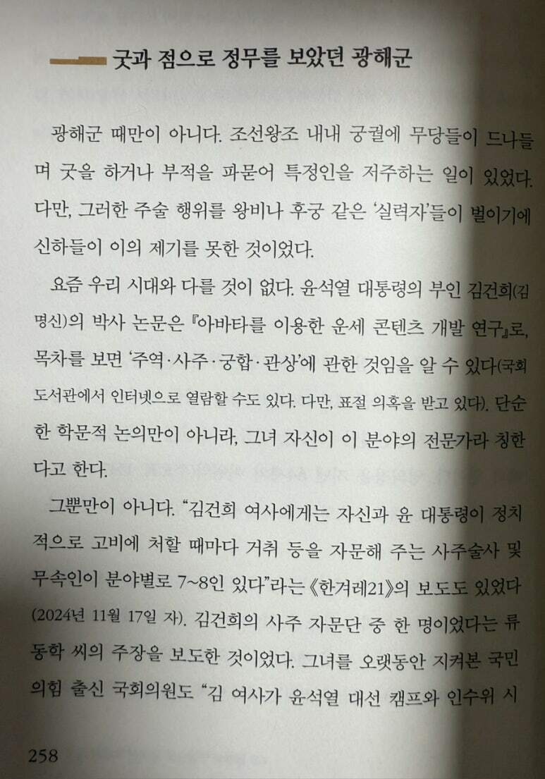 21세기 대한민국은 과학과 기술의 발전으로 인해 4차 산업혁명 시대를 맞이하고 있다. 그러나 인공지능, 빅데이터, 사물인터넷 등 혁신적인 기술들이 우리의 삶을 변화시키고 있는 이 시점에서, 우리는 여전히 미신과 주술이 사회의 여러 분야에서 뿌리 깊게 자리 잡고 있음을 목격하고 있다. 이러한 현상은 개인의 흥미이나 취미에 그치지 않고, 정치, 경제, 사회 전반에 걸쳐 영향을 미치고 있다. 최근 몇 년간 대한민국에서는 주술과 관련된 논쟁이 뜨겁게 일어났다. 이는 단순히 개인이 점을 보거나 주술을 의지하는 차원을 넘어, 국가의 운영과 통치에까지 영향을 미치는 문제로 비화되었다. 20대 대통령 선거 이후 불거진 대통령 집무실 이전 논란은 주술적 요소가 개입되었다는 의혹을 불러일으켰고, 이는 사회적 혼란을 가중시키며 합리적 판단을 저해하는 결과를 초래했다. 이러한 상황은 한반도 역사 속에서 정치 권력과 주술의 결탁이 얼마나 깊은 뿌리를 내리고 있는지를 다시금 상기시킨다.