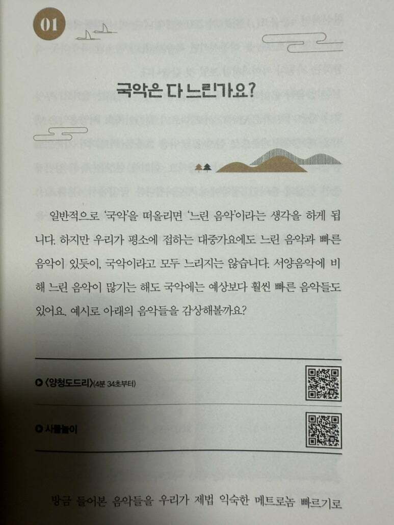 두 번째 부분에서는 국악과 관련된 흥미로운 사실들을 소개한다. 저자는 1980년대부터 시작된 창작국악의 발전을 설명하며, 현대 대중 음악에서 국악이 어떻게 활용되고 있는지를 다양한 사례를 통해 보여준다. BTS의 슈가가 전 통 음악을 현대 곡에 삽입한 예시와 같은 사례는 국악이 여전히 현대 사회에서 중요한 역할을 하고 있음을 시사한 다. 또한, 민속악과 정악의 차이를 설명하며, 판소리와 같은 전통 음악이 서민 문화와 어떻게 연결되어 있는지를 이 야기한다. 이를 통해 국악의 현대적 가치와 그 사회적 맥락을 이해할 수 있을 것 같다. 세 번째 부분에서는 국악곡의 비하인드 스토리를 다룬다. 저자는 판소리의 역사와 그 변화 과정을 설명하며, 특정 곡의 유래와 지역별 차이를 소개한다. 아리랑의 다양한 변형과 그 의미를 설명하고, 사물놀이와 같은 현대 국악 장르가 어떻게 발전했는지를 다룬다. 또한, 종묘제례악과 같은 전통 음악이 해외에서 더 유명해진 이유를 분석하며, 국악의 세계적 위상을 강조한다. 국악의 깊이와 그 문화적 중요성을 인식하는 계기가 되었다. 마지막으로, 저자는 국악에 대한 인식 조사를 통해 사람들의 생각과 개선점을 분석한다. 이를 통해 국악에 대한 대중의 인식을 이해하고, 국악 초심자들이 쉽게 접근할 수 있는 플레이리스트를 제공하여 국악의 매력을 느낄 수 있도록 한다. 저자의 이러한 노력은 국악이 현대 사회에서도 여전히 중요한 문화적 자산임을 강조하며, 국악에 대한 관심을 가질 수 있도록 유도한다.