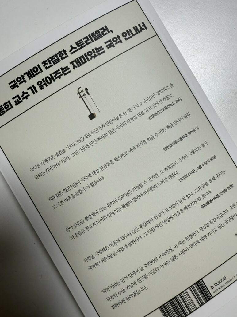 국악은 한국의 전통 음악으로, 그 깊은 역사와 문화적 가치를 지니고 있다. 최근 몇 년간 국악에 대한 관심이 급증 하면서, 다양한 매체에서 국악이 활용되고 있다할 것이다. 특히 드라마의 OST로 사용되거나, 국악을 노래하는 가수들이 등장하면서 국악은 새로운 전환점을 맞이하고 있다. 이날치, 악단광 등 젊은 음악인들이 탈바꿈시킨 대중 국악이 전 세계의 주목을 받고 있으며, 국악을 기본으로 한 크로스오버 음악과 창작국악이 뜨거운 관심을 받고 있는 것이다. 이러한 변화는 국악이 전통 음악을 넘어 현대 대중문화의 중요한 요소로 자리 잡고 있음을 보여준다. 아쉬운 것은 이러한 우리 전통 국악에 대해 쉽게 접근할 수 있도록 도와주는 책들이 많지 않은 것이었다. 이번에 이러한 아쉬움을 해소해 주는 신간을 읽을 기회가 있었다. 이동희님의<처음 만나는 국악 수업이었다. 저자는 흔히 오해하기 쉬운 우리 국악에 대한 오해들 소개부터, 국악의 현대적 활용 사례와 이를 통해 나타나는 문화적 현상 에 대해 심도 있고 재미있게 이야기 하고 있다. 국악은 현대 사회에서 그 가치를 새롭게 재조명받고 있으며, 앞으로도 다양한 형태로 발전할 가능성이 크다. 저자가 소개해 주는 국악 수업을 통해서 우리 국악의 매력을 더욱 많은 사람들에게 소개해 주어, 우리 한국의 전통 국악이 지속적으로 계승되고 발전할 수 있기를 바라는 마음이 생긴다.