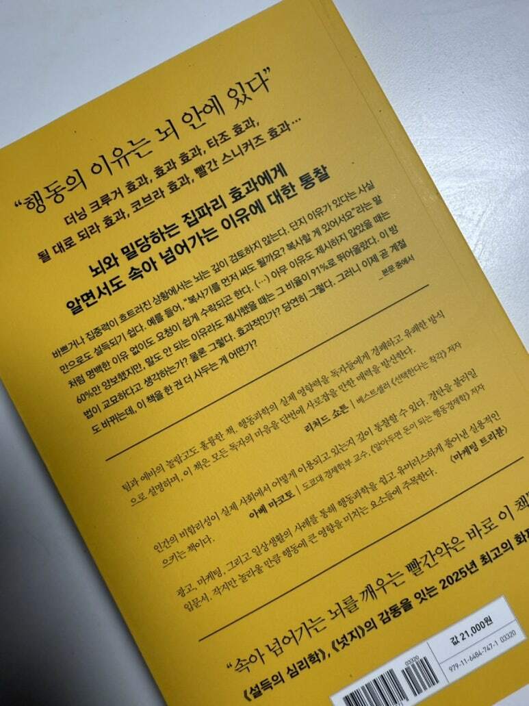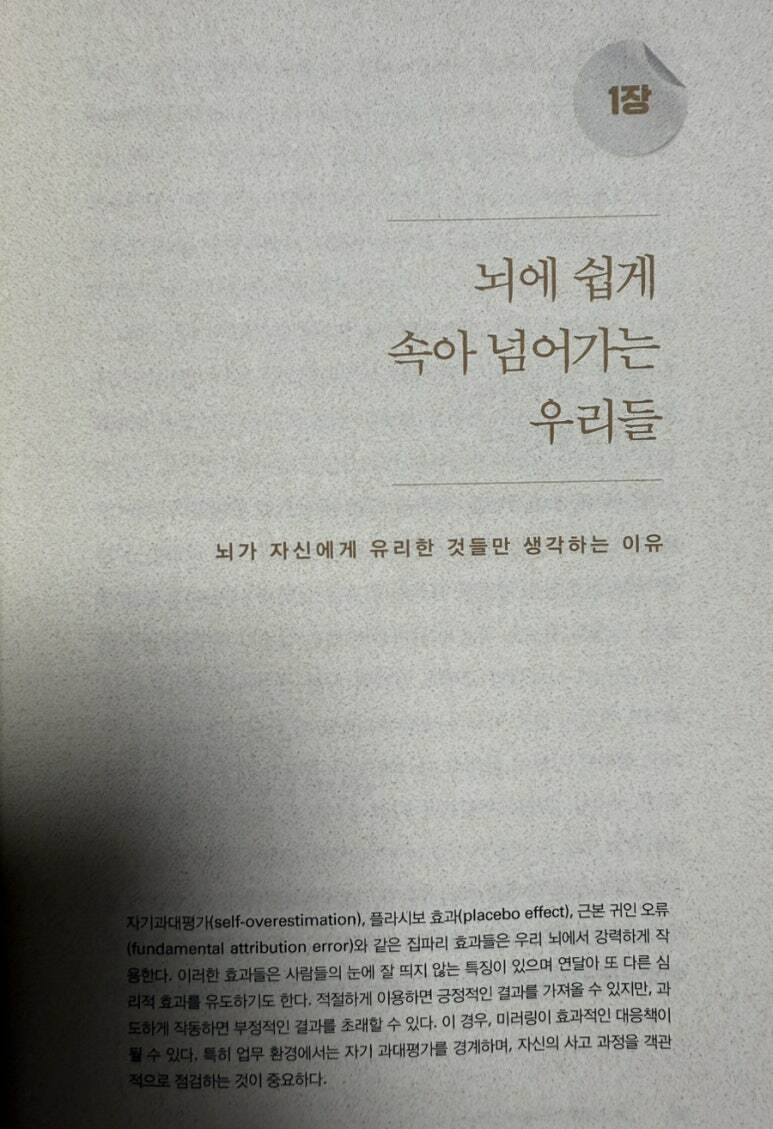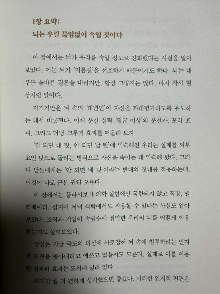 집파리 효과는 인간의 행동에 미세한 요소들이 큰 영향을 미친다는 것을 보여주는 개념이다. 이는 단순히 뇌 안에서 발생하는 것이 아니라, 실제로 세상에서 관찰되는 현상이다. 또한 인지 편향은 사람들이 정보를 처리하는 방식에서 발생하는 체계적인 오류로, 이러한 편향은 의사결정 과정에 큰 영향을 미친다. 저자는 집파리 효과로 작은 변화가 인간의 행동에 미치는 큰 영향을 설명한다. 예를 들어, 도로 표지판의 화살표 방향이 교통 체증에 미치는 영향은 이러한 효과를 잘 보여준다. 또한, 생선의 이름을 바꾸는 것만으로도 소비량이 증가하는 현상은 집파리 효과의 또 다른 예시이다. 이러한 사례들은 인간의 행동이 얼마나 미세한 요소에 의해 좌우될 수 있는지를 잘 보여준다. 인지 편향은 사람들이 정보를 처리하는 과정에서 발생하는 오류로, 여러 종류가 있다. 과신 편향은 사람들이 자신의 능력이나 지식을 과대평가하는 경향을 말하며, 확인 편향은 자신의 신념을 지지하는 정보만을 선택적으로 수용하는 경향을 의미한다. 이러한 편향들은 의사결정 과정에서 비합리적인 결과를 초래할 수 있다. 집파리 효과는 인지 편향을 유도하는 중요한 요소로 작용할 수 있다. 사람들이 이유가 있다는 사실만으로도 설득되는 현상은 집 파리 효과의 일종으로 볼 수 있다. 이는 사람들이 깊이 있는 검토 없이 단순한 이유에 의해 행동을 결정하는 경향을 보여준다. 직장에서 팀원들에게 자신의 기여도를 추정하게 하는 활동은 집파리 효과와 인지 편향을 잘 보여준다. 팀원들은 자신의 기여도를 과대평가하는 경향이 있으며, 이는 팀의 전체 기여도가 100%를 초과하는 결과를 초래한다. 홈쇼핑에서의 과장된 홍보 문구는 소비자들이 쉽게 설득되는 이유를 잘 설명해준다. 이러한 사례들은 집 파리 효과와 인지 편향이 일상생활에서 어떻게 나타나는지를 보여준다. 저자는 여러 상황에 있어서의 다양한 사례를 상세한 설명과 함께 이야기 해 준다.