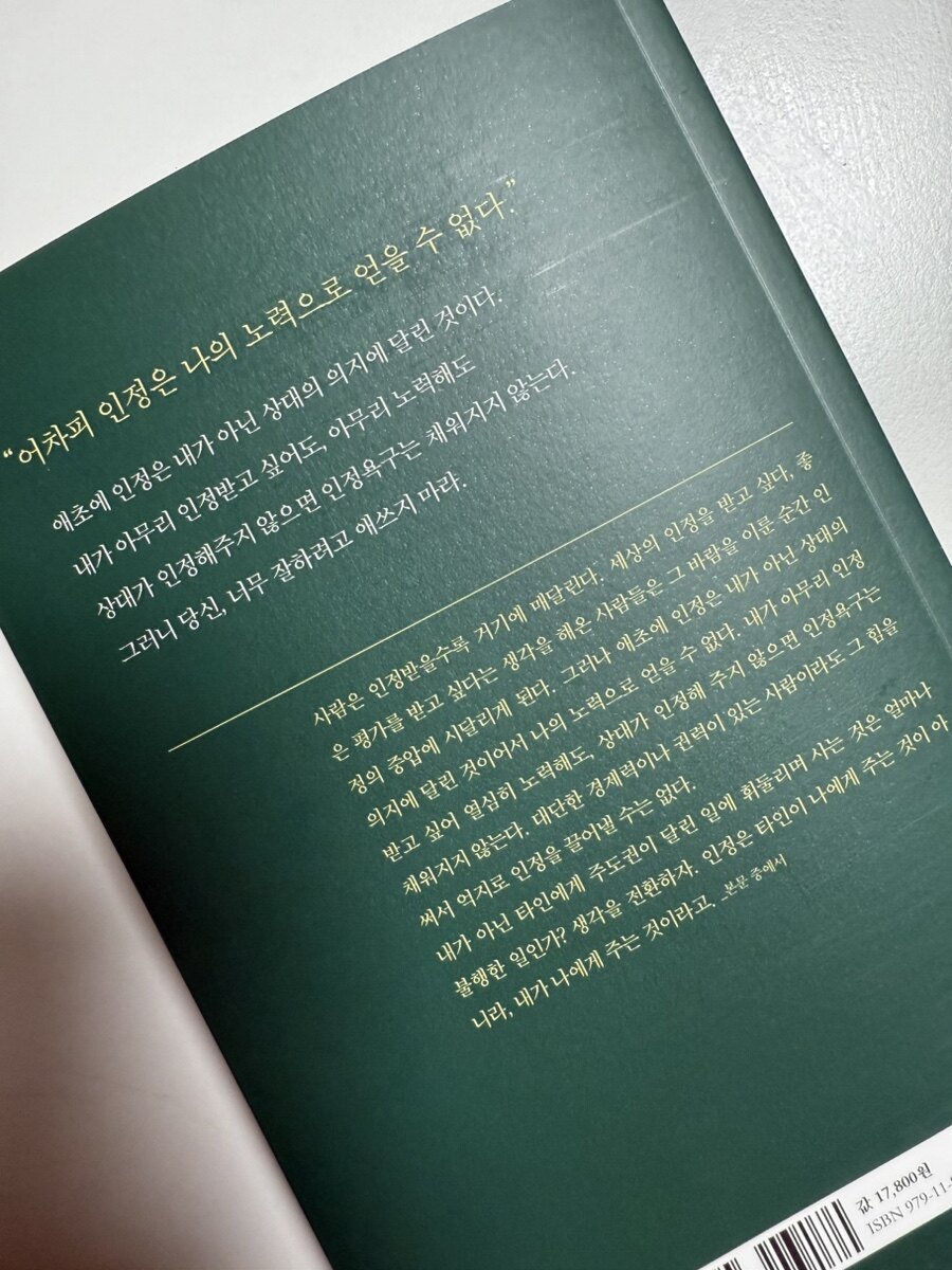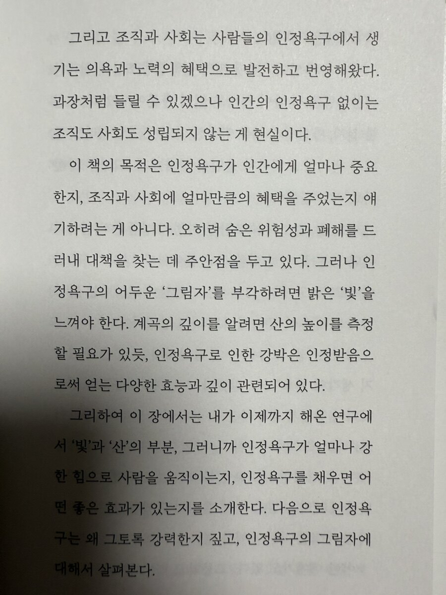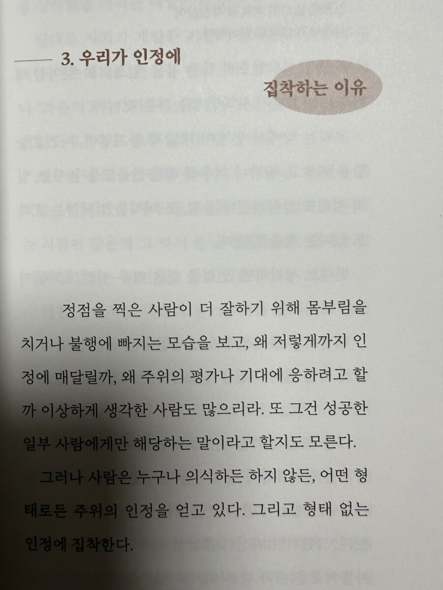 저자가 이야기 하는 것과 같이, 현대 사회에서 인정 욕구는 필연적으로 존재하지만, 이를 지나치게 추구하면 부정적인 결과를 초래할 수 있다. 불안감, 번아웃, 인간관계의 왜곡 등 다양한 부작용이 나타날 수 있으며, 이러한 문제를 해결하기 위해서는 자기 인식, 타인의 기대 관리, 사회적 비교 줄이기, 긍정적인 인간관계 형성이 필요할 것 같다. 결국, 우리는 자기 자신을 인정하고, 타인의 기대를 넘어서는 삶을 살아가야 할 것이다. 이 책을 통해 인정 욕구에 대한 사례를 통해서 자신의 상태를 돌아보고, 내면의 인정 욕구를 건강하게 다룰 수 있는 방법 실천을 통해 내 삶의 주도권을 찾아가야 겠다.